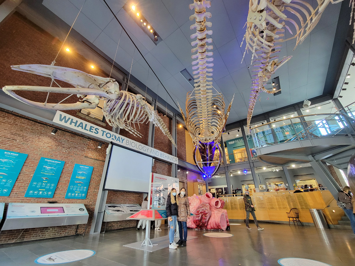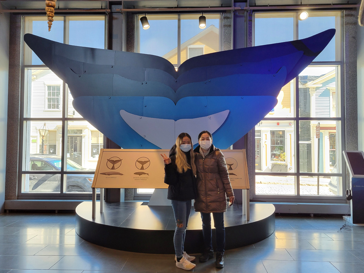 여러 종류 고래의 꼬리 크기를 비교한 전시물 앞에서 아직은 실내 마스크를 한 모녀의 모습이다.