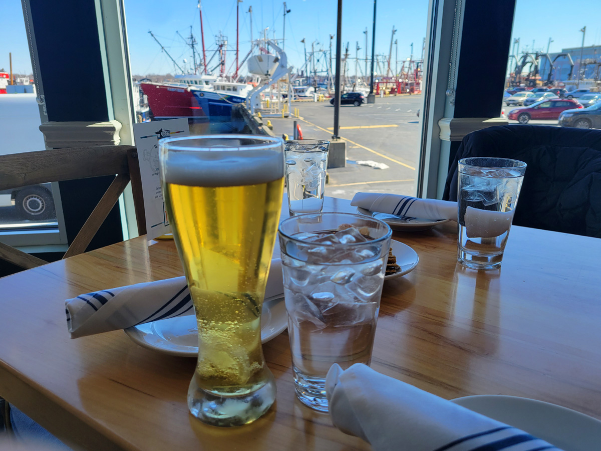 시원한 맥주가 한 잔 먼저 나왔다~ 창밖으로는 항구의 풍경이기는 한데, 요트가 떠 있는 것이 아니라... 커다란 어선들이 빼곡히 정박해 있는 어업기지(?)의 모습이었다.
