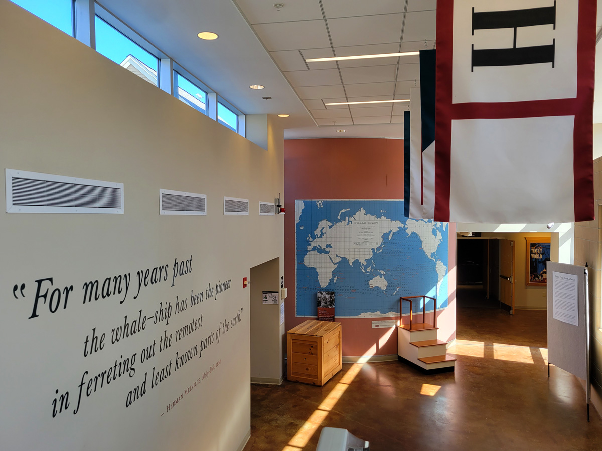 직원의 안내에 따라서 소개영화를 보기 위해서 극장으로 이동하는 통로의 벽에 아래와 같은 소설 <백경>에 나오는 글귀가 씌여있고, 이 항구를 출발한 포경선들이 돌아다녔던 바다들이 표시된 세계지도가 벽에 걸려있다.