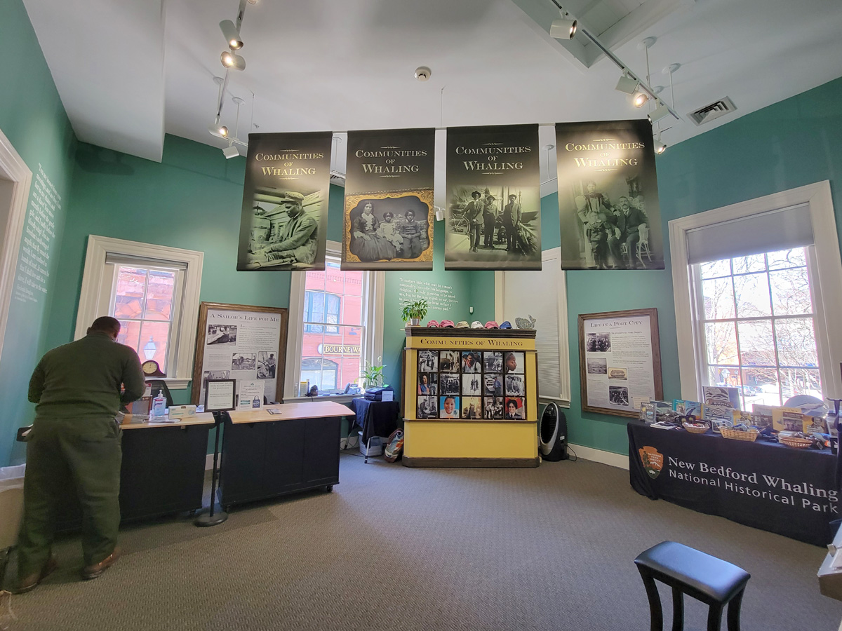 우리를 아주 반갑게 맞아주고, 위기주부가 수집하는 공원 브로셔도 먼저 뽑아서 건네 주었던 직원의 뒷모습이 나왔다. 그가 건넨 브로셔는 2개였는데 다른 하나는 남부 흑인노예들의 탈출을 의미하는 '지하철도(Underground Railroad)'에 관한 것으로, 당시 뉴베드포드가 남부를 탈출한 흑인들이 자유를 얻어서 생활한 대표적인 북부의 도시들 중 하나이다. 지난 연말에 동네 근처 내셔널하버 여행기에서 소개했던 노예제 폐지론자인 프레더릭 더글라스(Frederick Douglass)도 자유인으로 처음 뉴베드포드에 정착했고, 앞바다 낸터컷(Nantucket) 섬의 집회에서 1841년의 연설로 일약 유명인사가 되었다.