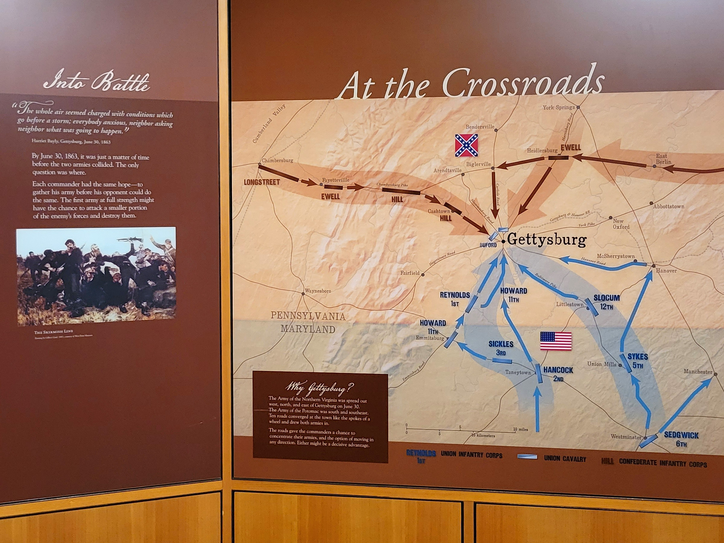 게티스버그 전투에서 남군이 패배하고 물러나면서, 결국 남북전쟁이 북군의 승리로 끝나는 결정적 계기가 되었다. 벽면에 붙은 수 많은 흑백사진의 주인공들을 포함해 양측 합계 약 5만명의 사상자가 발생했는데, 이는 전투에 참가했던 군인들의 1/3에 해당하는 처철하고 치열한 전투였다는 방증이다.