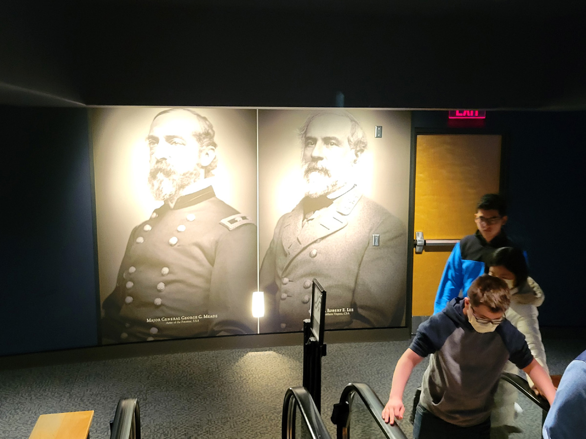 영화가 끝나면 관객석 제일 위쪽의 뒷문으로 나가라고 하는데, 그러면 사진의 두 에스컬레이터가 모두 위쪽으로 올라가고 있다. 뒤돌아 보고 찍은 사진에서 오른편은 남군의 총사령관 로버트 리(Robert Lee)이고, 왼편은 북군의 지휘관 조지 미드(George Meade)의 모습이다.