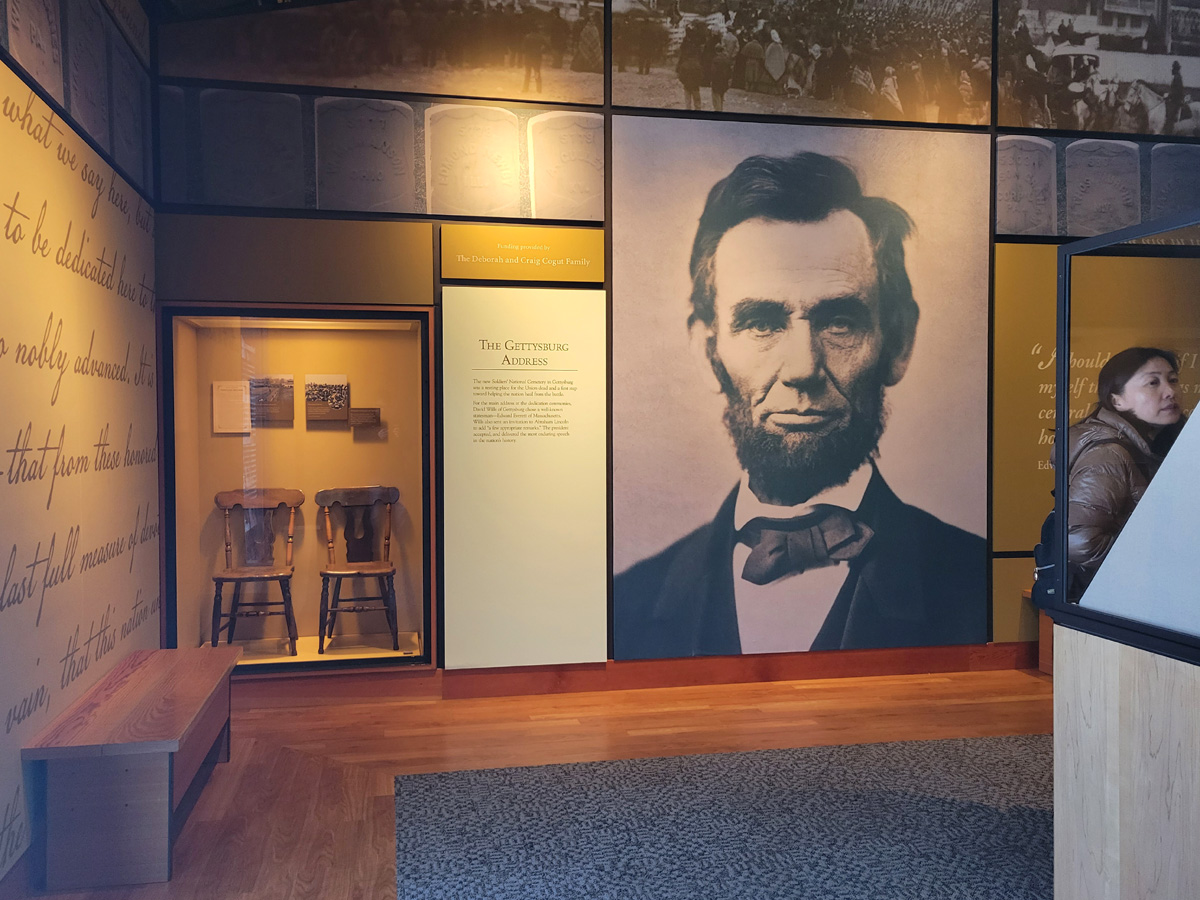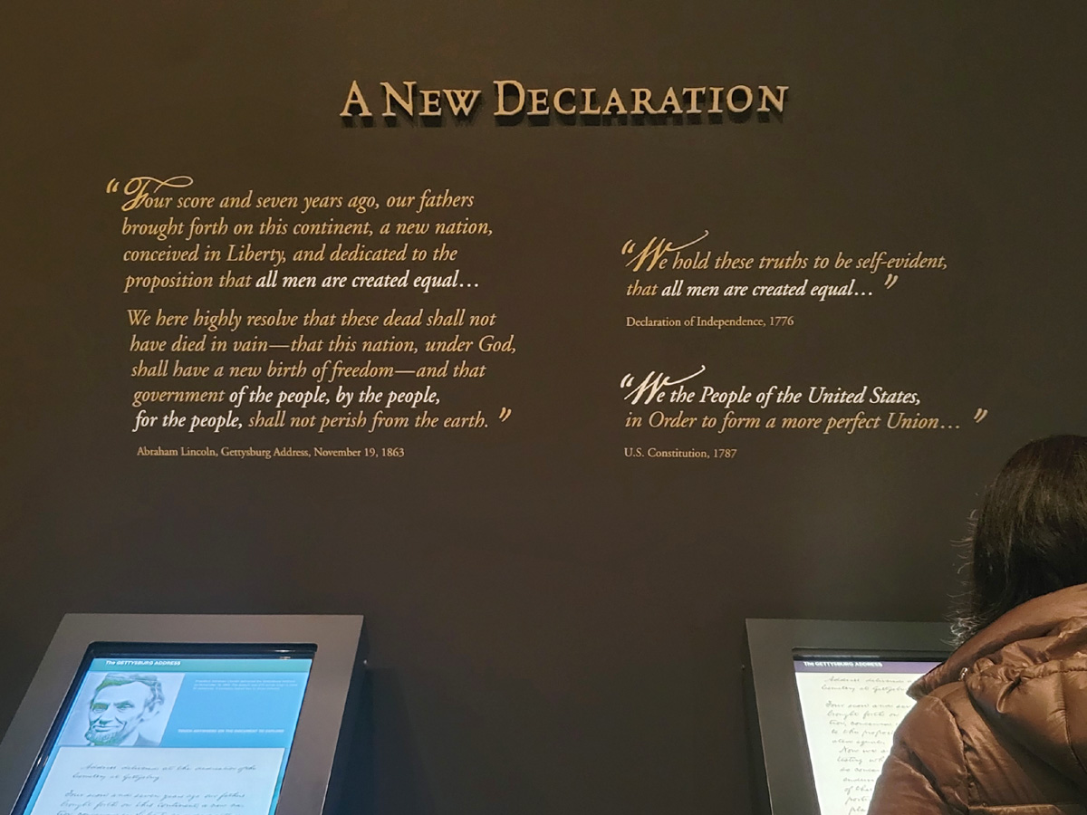 "87년 전 우리의 선조들은 이 대륙에 자유의 정신으로 잉태되고 만인이 평등하게 창조되었다는 신념이 바쳐진 새로운 나라를 세웠습니다. ... 이 분들의 죽음을 무위로 돌리지 않으리라 이 자리에서 굳게 결단하여야 하며, 이 나라가 하나님 아래에서 자유의 새로운 탄생을 누려야 할 뿐 아니라, 국민을 위한, 국민에 의한, 국민의 정부가 지상에서 소멸하지 않아야 한다는 그 위대한 사명에 우리 스스로를 바쳐야 합니다."로 번역되는 연설의 처음과 끝이 왼쪽에 씌여있고, 그것이 미국의 독립선언과 헌법전문을 하나로 함축하는 '새로운 선언'이라 정의하고 있다. 이제 밖으로 나가서 링컨이 연설을 했던 곳과 실제 전투가 벌어졌던 장소들을 돌아볼 차례이다.