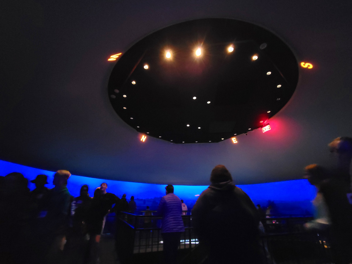 비지터센터 건물이 원형의 실내체육관같이 컸던 이유는 꼭대기에 이렇게 동서남북 방위가 표시된 넓은 원형의 공간이 만들어져 있기 때문인데, 그 원형 실내의 벽면을 따라서 푸르스름한 조명을 받고 있는 것은...