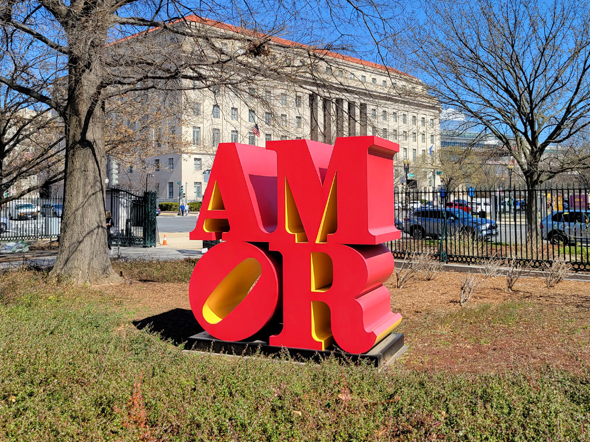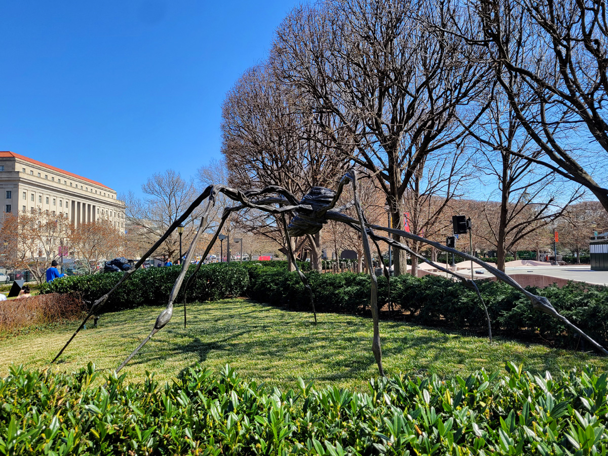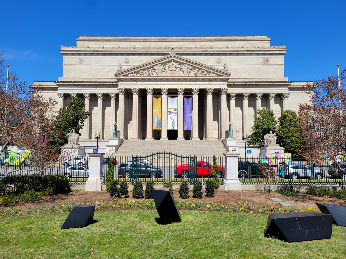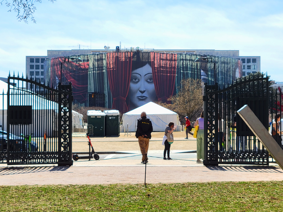 동쪽 입구에서 남쪽으로 바라보면 커튼 뒤로 다크서클이 심한 여자의 무서운 얼굴이 보인다. 내셔널몰 건너편에 있는 스미소니언의 허쉬혼 현대미술관(Hirshhorn Museum and Sculpture Garden)이 외관 리모델링 공사를 하면서 가림막을 쳐둔 것인데, 저 걸개그림은 지나다니며 자주 봤으니 깔끔하게 공사가 끝나면 저기도 한 번 방문을 해야겠다. 또 미술공부 하려고?