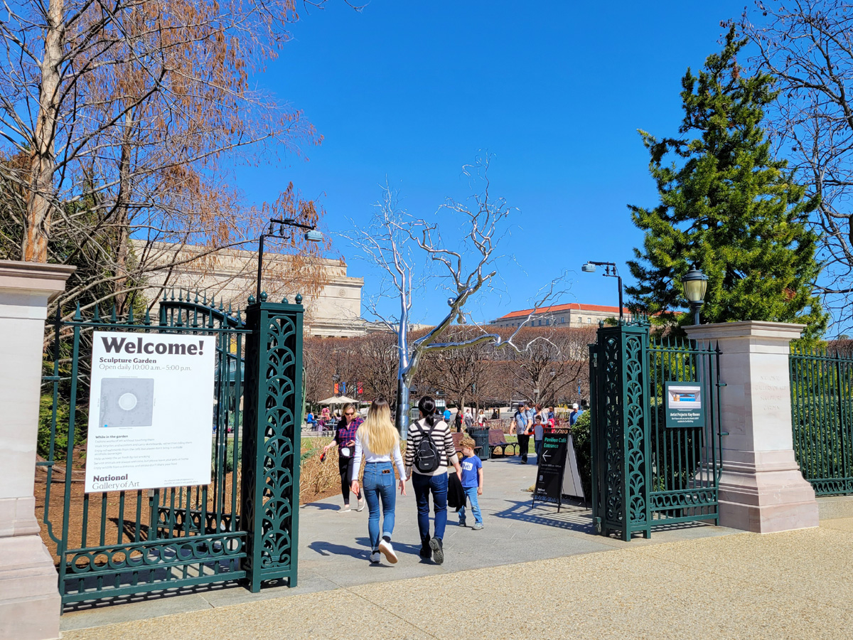 별 생각없이 우리의 발길이 다음으로 향한 곳은 국립미술관 서쪽에 있는 야외 조각정원(Sculpture Garden)이었다. (구글맵으로 위치를 보시려면 클릭) 왼편 "Welcome!" 안내판 아래의 그림처럼 정사각형의 정원의 가운데 겨울에는 스케이트장으로 사용되는 큰 분수가 있고, 그 주변으로 커다란 현대조각 작품들이 전시되어 있다.