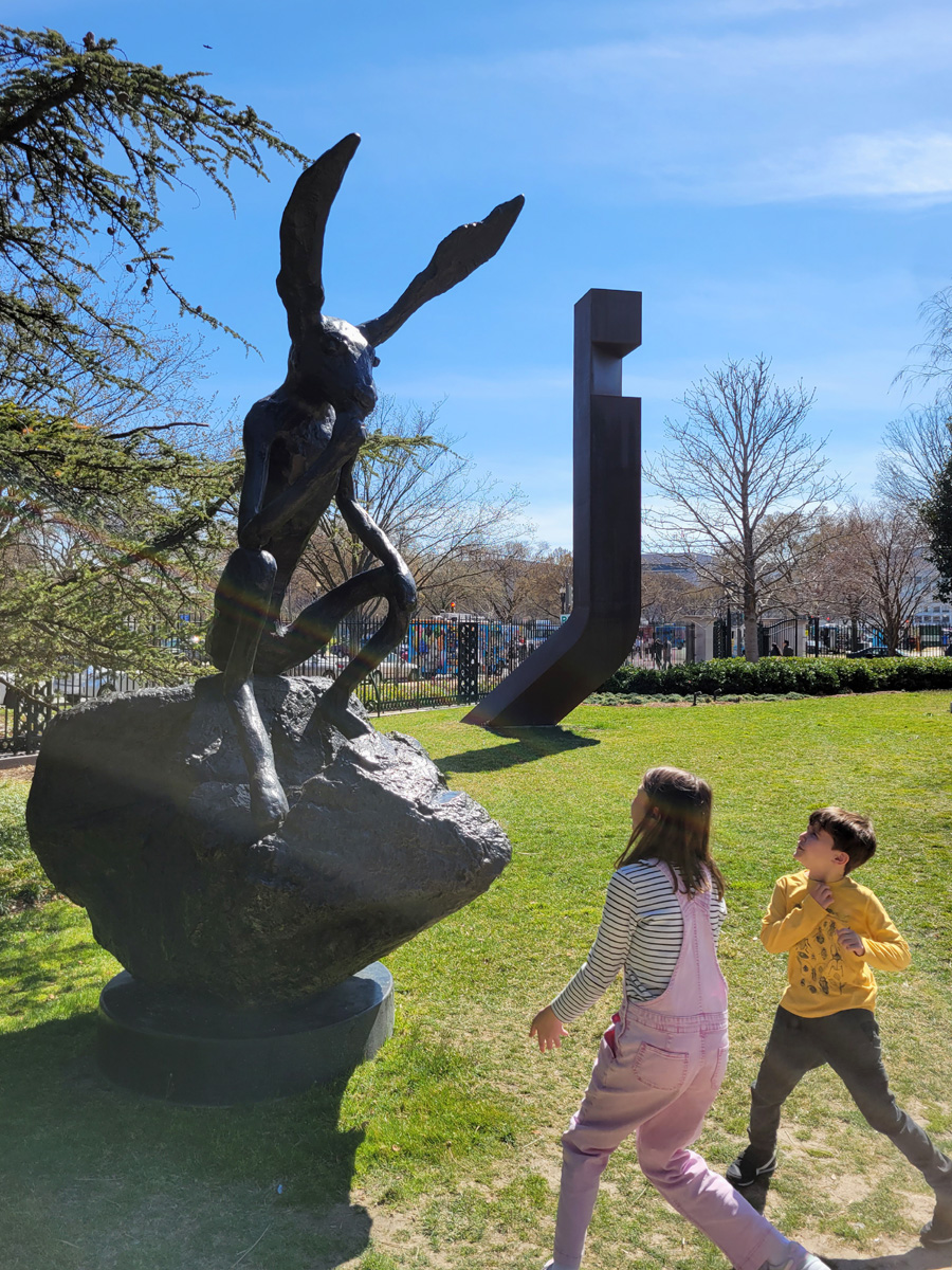 바위에 걸터앉아 생각하는 토끼를 아이들이 신기한 듯이 바라보고 있다. 뒤쪽에 휘어진 쇠막대기도 당연히 조각작품...