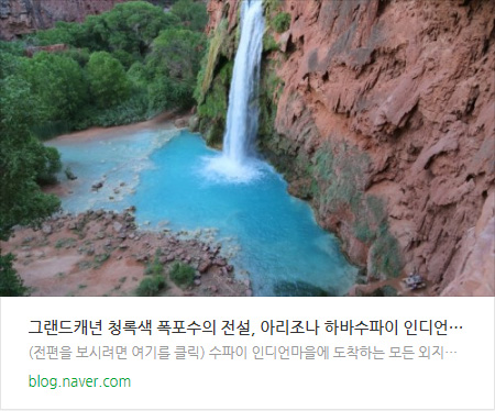 브라이스캐년의 폭포에 실망하신 분이라면, 위의 사진을 클릭해서 그랜드캐년의 숨겨진 비경인 하바수 폭포(Havasu Falls)의 모습을 감상해보시기 바란다~