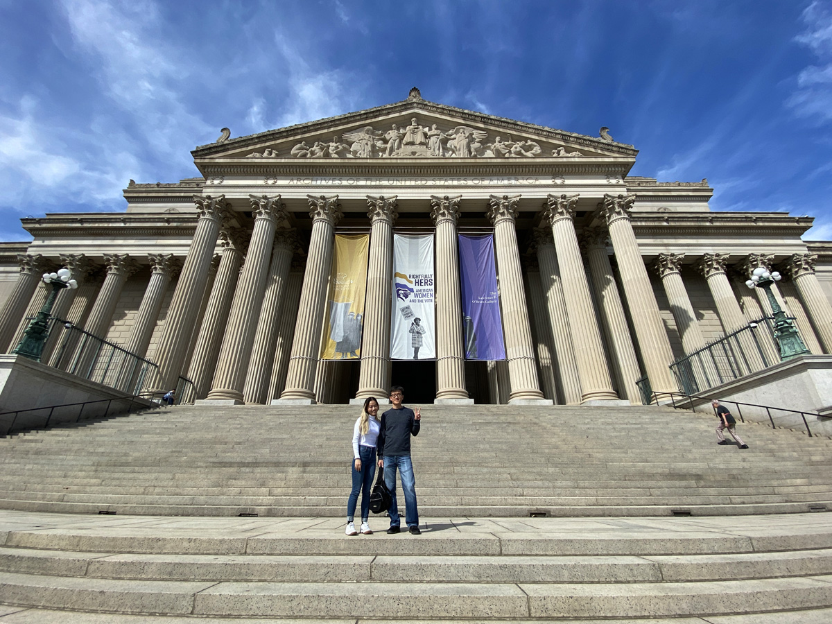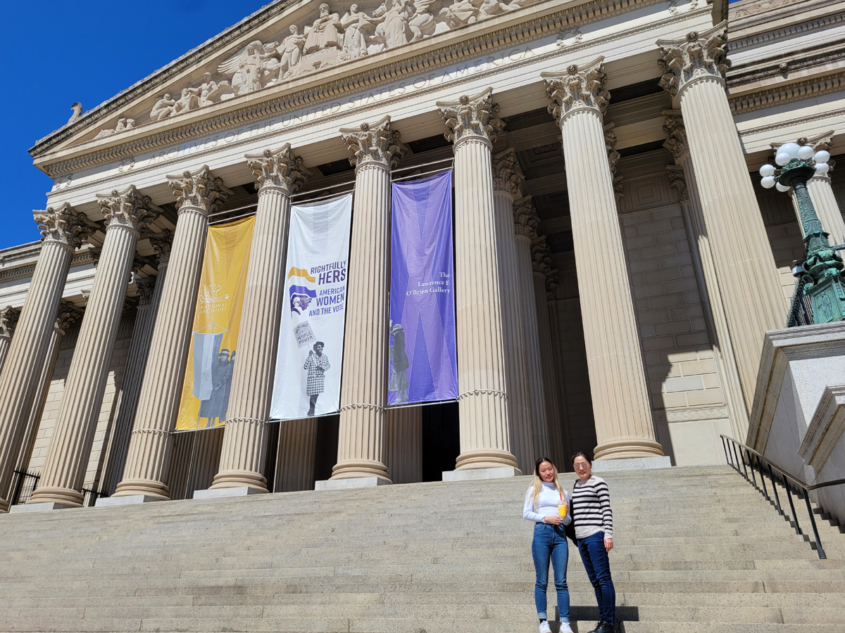 망고 맛으로 고른 버블티를 들고 신전같은 건물의 입구에서 모녀가 사진을 찍었다. 기둥들 사이에는 3월 여성의 달을 맞아서 여성참정권과 관련한 특별전시가 열리고 있다는 것을 알리는 배너가 걸려있다.