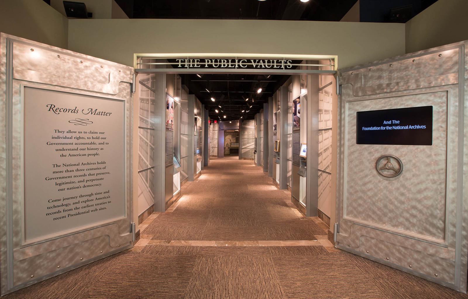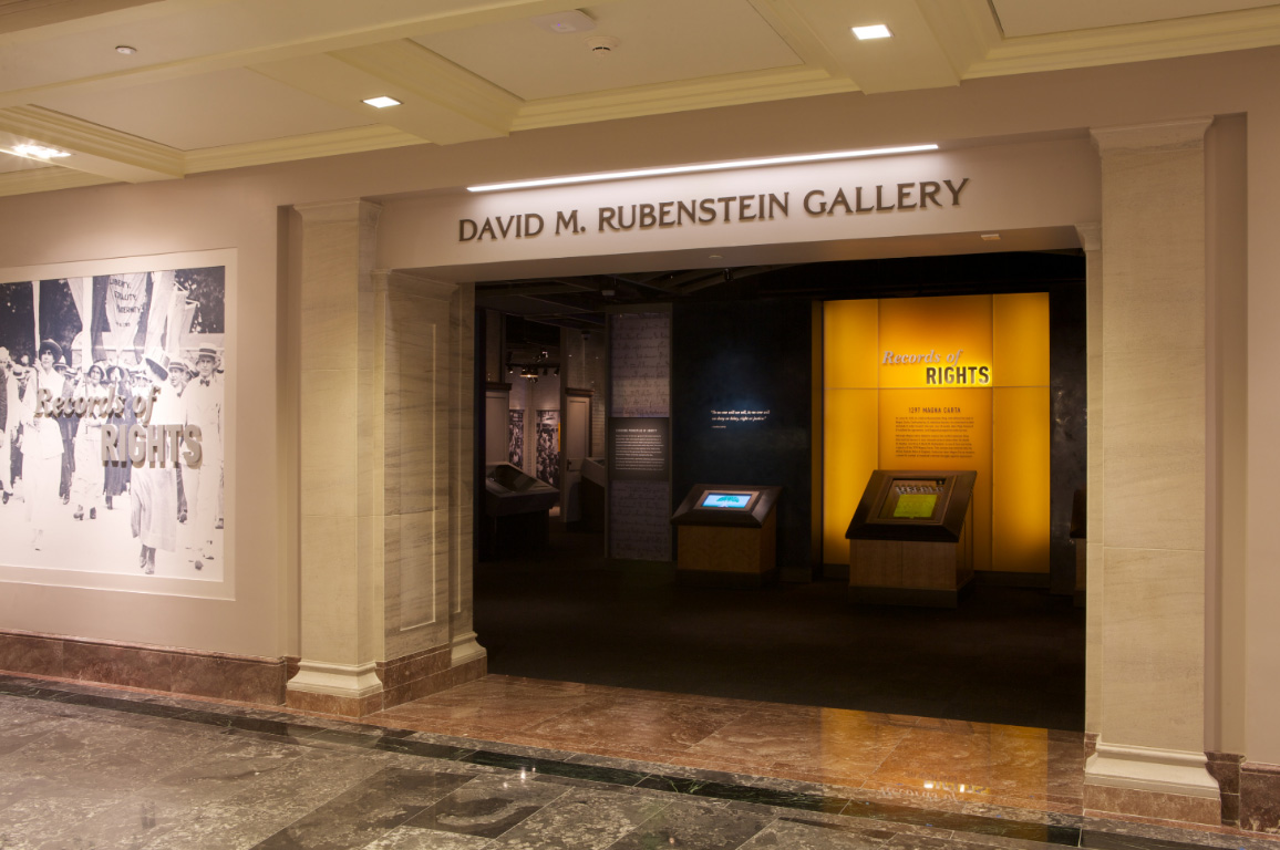 1층 입구의 정면에는 David M. Rubenstein Gallery라고 명명된 '권리의 기록(Records of Rights)' 상설전시실이 있다. 데이비드 루벤스타인은 세계최대 사모펀드 중의 하나인 칼라일그룹(Carlyle Group)의 창업자인 억만장자로 2011년에 이 전시실을 새로 만드는데만 13.5백만불을 기부했는데, 그 뿐만이 아니라 사진 오른편에 보이는 노란색 특수 보관함에 들어있는 오래된 양피지 한 장을 2007년 경매에서 21.3백만불에 사서는 이 곳에 영구대여 형식으로 기증했다.