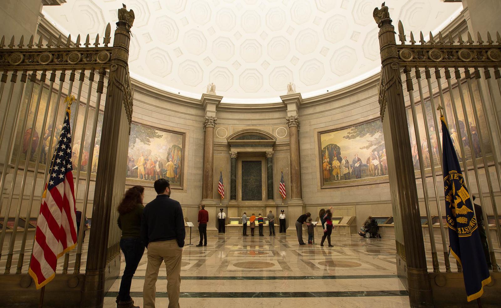 각각 독립선언서와 헌법을 제출하는 장면을 상상으로 묘사한 중앙홀 좌우 둥근 벽면의 포크너 벽화(Faulkner Murals)는 캔버스를 벽에 부착해서 그린 그림으로는 미국에서 가장 크다고 한다. 하지만 실제로는 어두워서 그림이 있는지도 잘 모를 정도였고, 모든 전시박스 앞에는 사람들이 빼곡히 서서 시계방향으로 천천히 움직이면서 관람을 하게 된다.