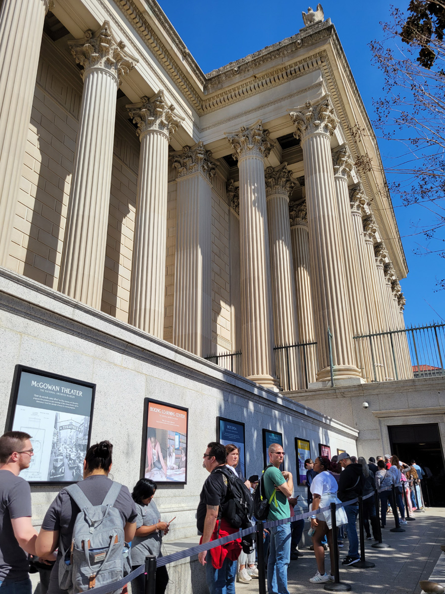 푸른색 바탕의 박물관 로고가 무슨 그림인가 했더니, 독수리의 머리와 날개로 건물 정면 꼭대기 좌우에 만들어진 조각을 형상화한 것이었다. 입장하는 줄이 두 개로 나누어진 것이 보이는데, 그냥 기다려서 들어가는 사람들이 왼편에 서있고, 비어있는 오른편은 티켓을 예매한 사람들이 기다리지 않고 들어갈 수 있는 줄이다. 여기를 클릭해서 recreation.gov 사이트에서 일인당 $1로 예매가 가능한데, 이 날 우리는 예매없이 5분 정도만에 들어갔지만 여름방학 성수기에는 30분 이상 기다리는 경우도 많다고 한다.