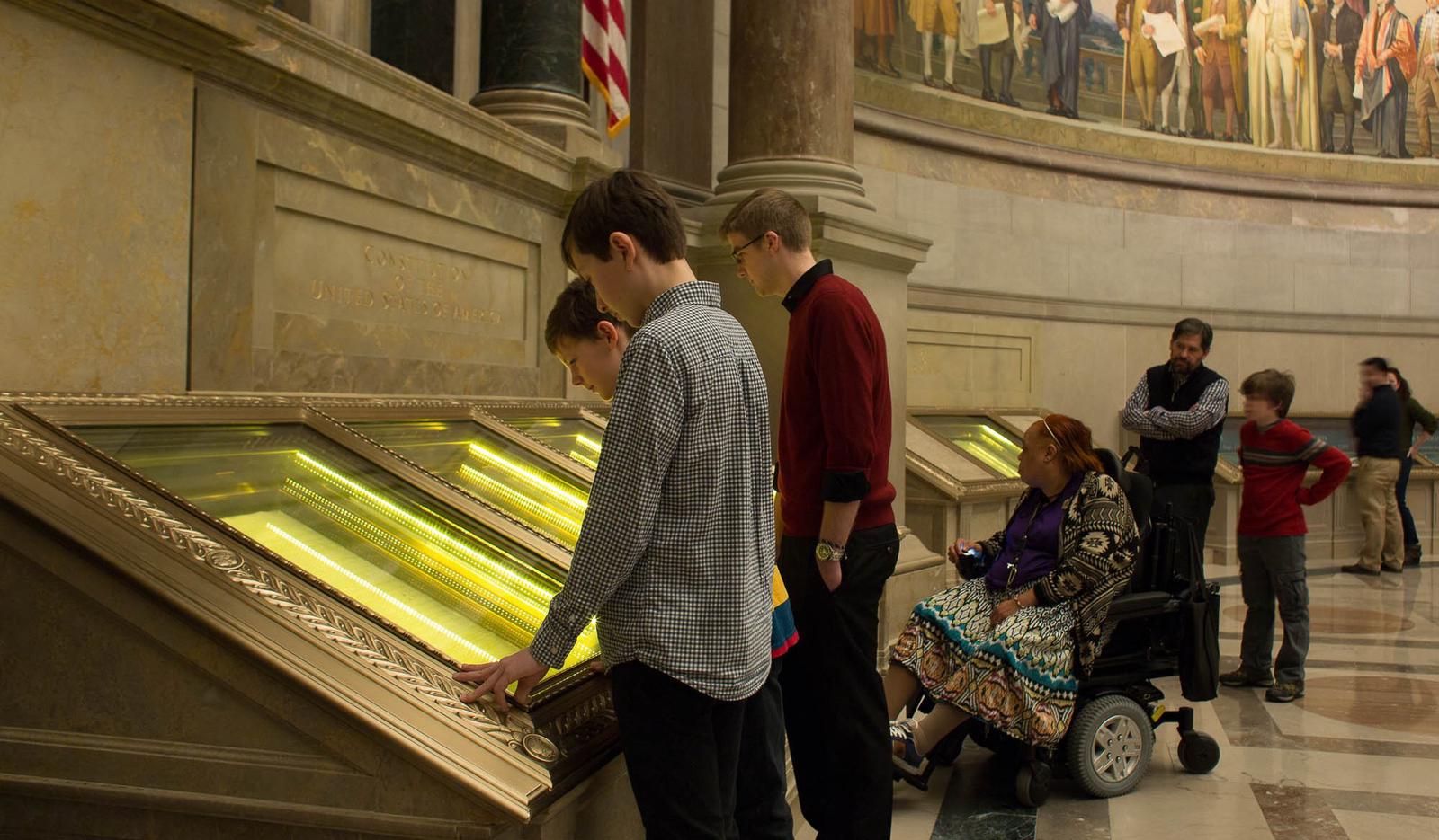 커다랗게 씌여진 "We the People"로 시작하는 1787년에 씌여진 미국 헌법(Constitution of the United States) 4페이지를 휠체어에 앉으신 분까지 총 4명만 보고 있지만, 현실은 우리처럼 제일 앞에서 빈틈을 주지 않고 여기까지 움직여 온게 아니라면 가까이서 직접 읽어보는 것은 불가능하다. (뒤에 서있는 사람들이 빈틈이 생기면 바로 침투해 들어옴^^) 또 사람들 뒤쪽에도 경비원들이 지키고 있어서 주머니에서 핸드폰을 꺼내기만 해도 바로 제지가 들어왔다.
