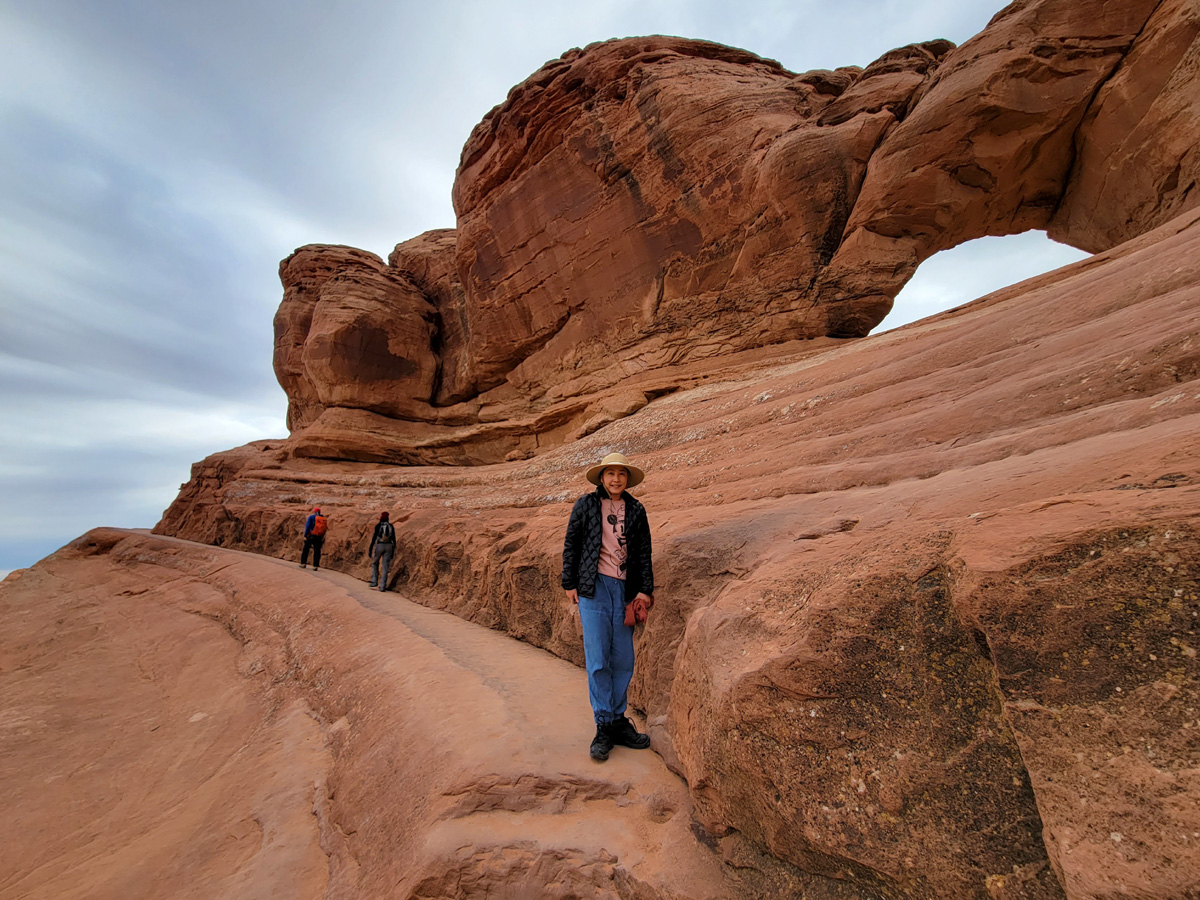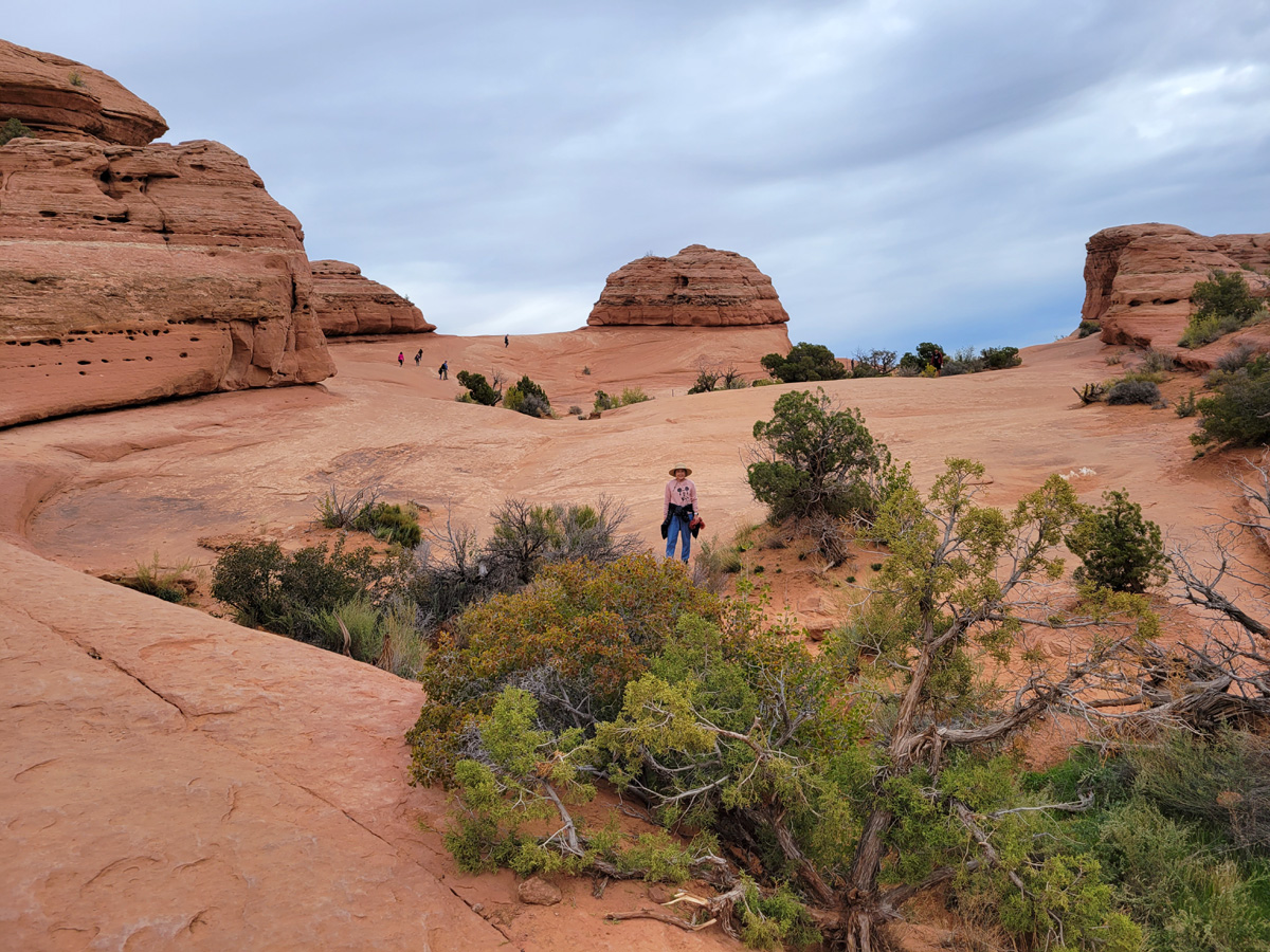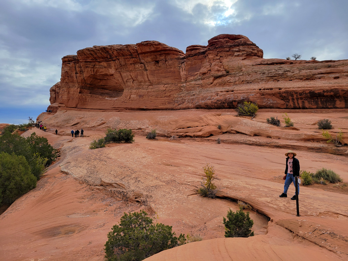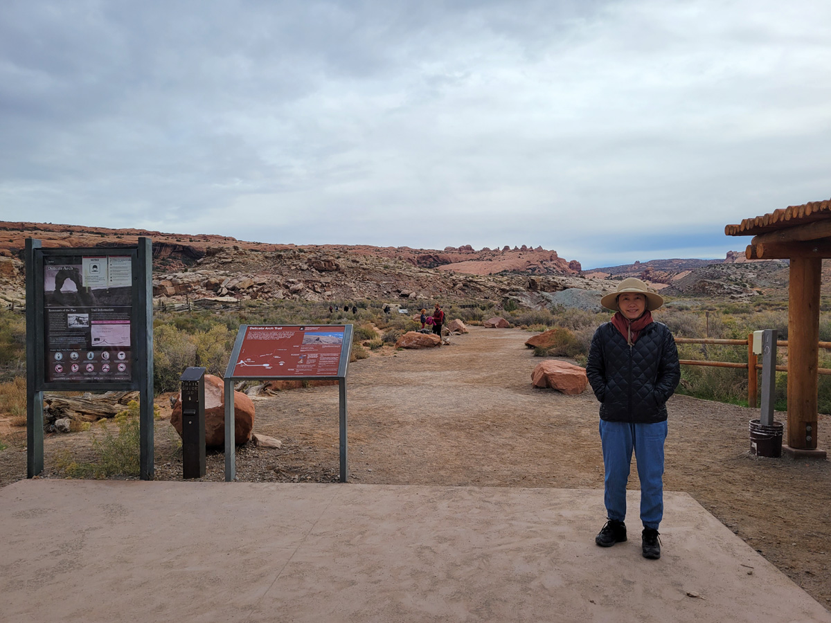 그렇게 만사를 제쳐두고 찾아간 곳은 여기 델리키트아치 트레일(Delicate Arch Trail)이 시작되는 곳인데, 정말로 넓은 주차장에 마지막 남은 딱 한자리에 운 좋게 주차를 했다. (구글맵으로 위치를 보시려면 클릭) 전날은 이삿짐에서 비치모자를 찾아서 썼던 사모님이 오늘은 농부모자를 쓰고 트레일을 하신다~