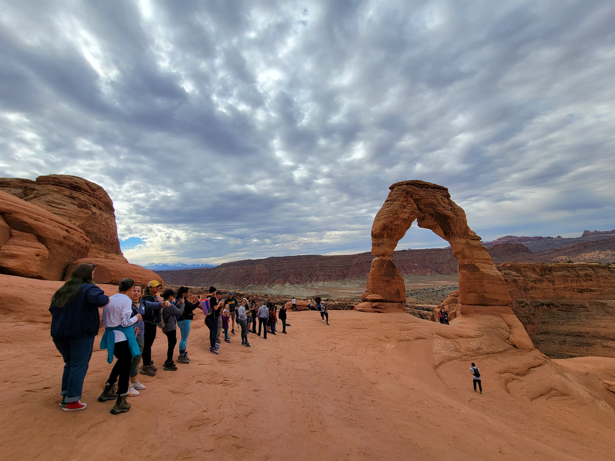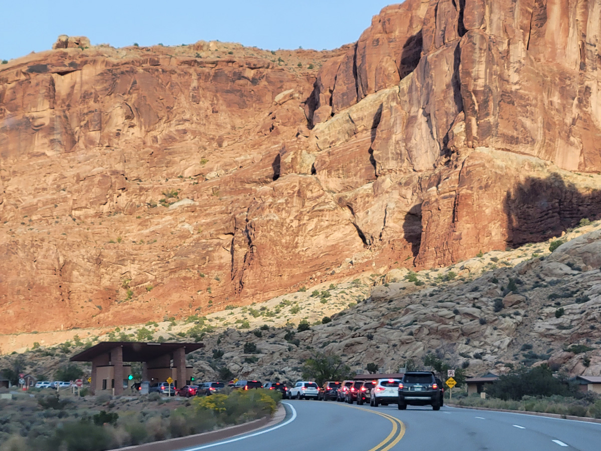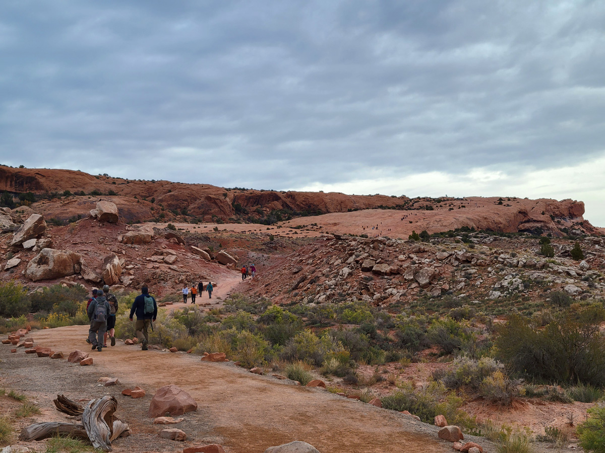 작별하고 돌아서는데 우리가 기다릴 때보다 줄이 더 길어진 것을 보니 괜히 즐거운...^^ 델리키트 아치를 보며 아침도 잘 먹었겠다~ 이제 주차장으로 돌아가서 12년 전에는 그냥 잠깐 멀리서 보기만 했던 다른 커다란 아치들이 있는 곳으로 가서 그 아래까지 또 트레일을 하기로 했다.
