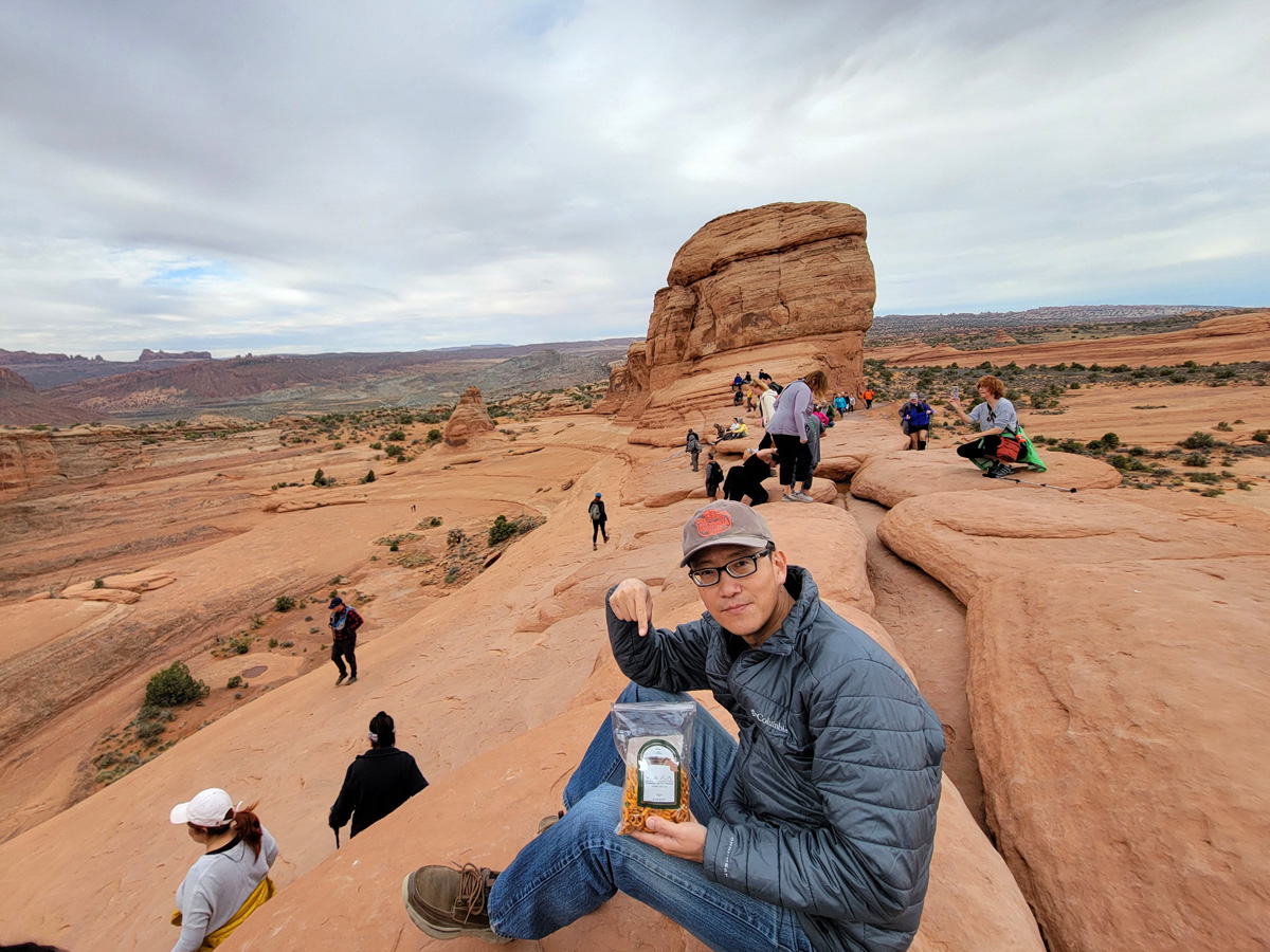 이른 아침부터 기다란 줄이 만들어진 아치스 국립공원(Arches National Park)의 입구를 지나서 바로 바위산을 넘어가는데, 브로셔의 공원지도를 보던 아내가 여기 안에는 아침을 사먹을 수 있는 곳이 하나도 없다는 사실을 발견했다! 빈 속에 왕복 3시간 트레일을 할 수는 없었기에 차를 돌려서 입구 옆 비지터센터로 돌아가서, 기념품 가게를 뒤진 끝에 정체불명의 에너지바와 마운틴믹스를 겨우 발견했을 때 얼마나 기뻤는지 모른다~^^