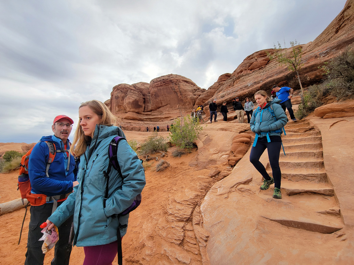 경사가 급한 바위를 깍아서 계단까지 잘 만들어 놓은 트레일인데, 벌써 돌아오는 하이커들은 델리키트아치에서 일출을 보기 위해 새벽에 출발한 부지런한 분들이시다.
