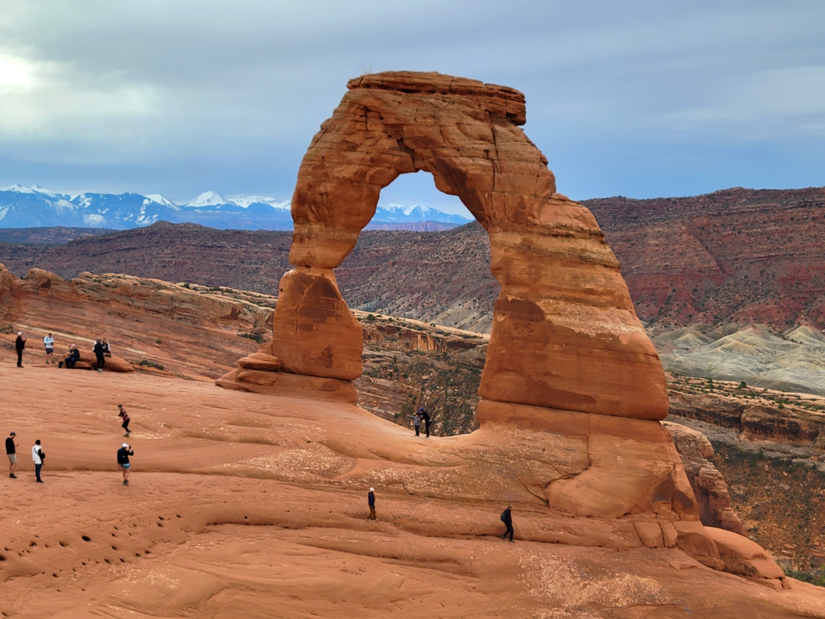 이 때는 10월이라서 아치 너머로 멀리 흐린 하늘 아래에 눈 덮인 라살(La Sal) 산맥이 보이지만, 지난 번에는 뜨거운 파란 하늘 아래에 붉은 아치가 더욱 선명히 보였었다.