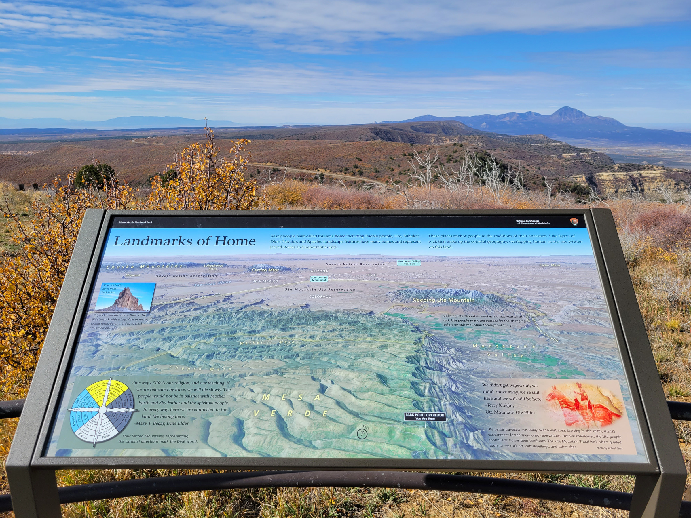 안내판의 조감도를 보면 저 너머가 콜로라도, 유타, 뉴멕시코, 아리조나 4개의 주가 만나는 곳이라 되어있다. (그랜드서클 여행에서 직접 방문했던 포코너(Four Corners)와 그 너머의 모뉴먼트밸리(Monument Valley)는 각각을 클릭해서 여행기를 보실 수 있음) 그러나, 지금 서있는 높이에서는 언덕에 가려서 조감도와 같이 모두 볼 수는 없었지만, 여기서 45마일 떨어졌다고 되어있는 안내판 왼쪽 작은 사진 속의 뉴멕시코 주 쉽락(Shiprock) 바위는...