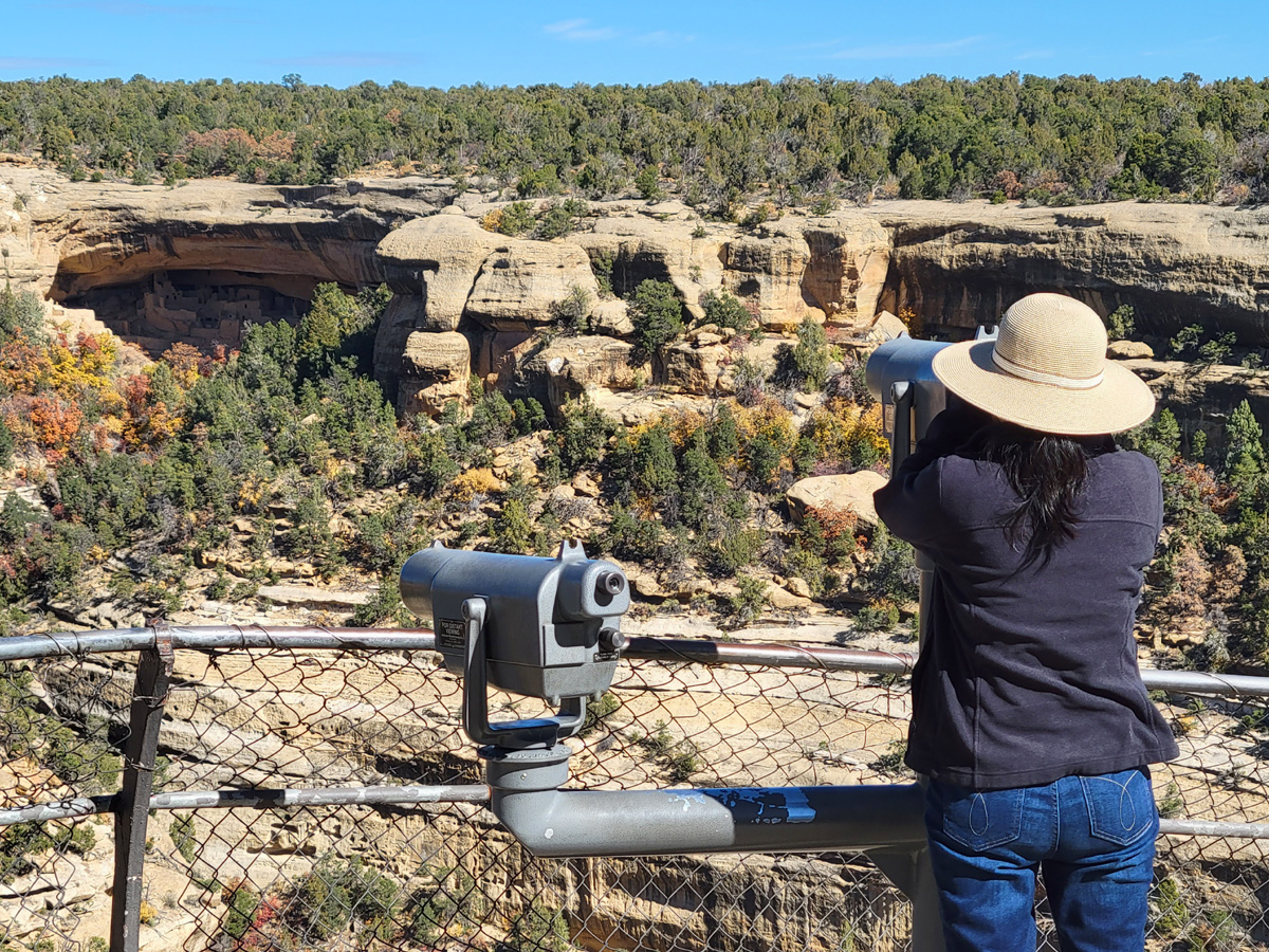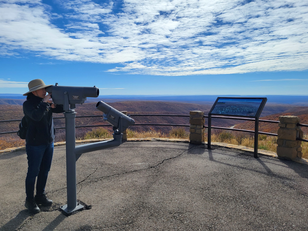 다음으로 Sun Point View 전망대에서 망원경으로 제일 왼쪽의, 이 공원에서 가장 유명한 클리프팰리스(Cliff Palace)를 아내가 보고 있다. 하지만 여기서는 그 '절벽궁전'은 가장 멀고 또 나무에 가리는 대신에