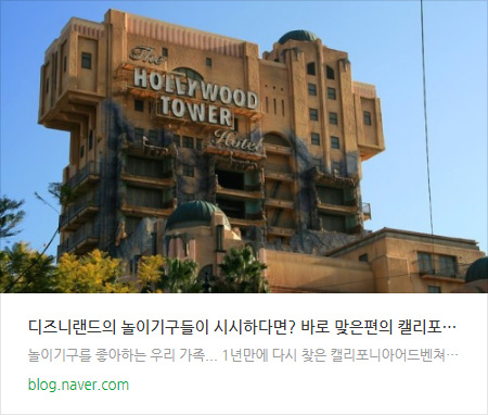 이제는 더 이상 볼 수 없는 캘리포니아어드벤쳐에 있던 헐리우드타워호텔의 외관 모습인데, 원조 디즈니월드와는 건축양식부터 색깔까지 많이 다른 것을 알 수 있다. 하지만, 내부의 테마와 라이드 자체는 똑같아서 위의 사진을 클릭하시면, 당시 10년전의 우리 가족 모습과 함께 공원 문 열자마자 3번을 연달아서 탔던 이야기를 직접 보실 수 있다.
