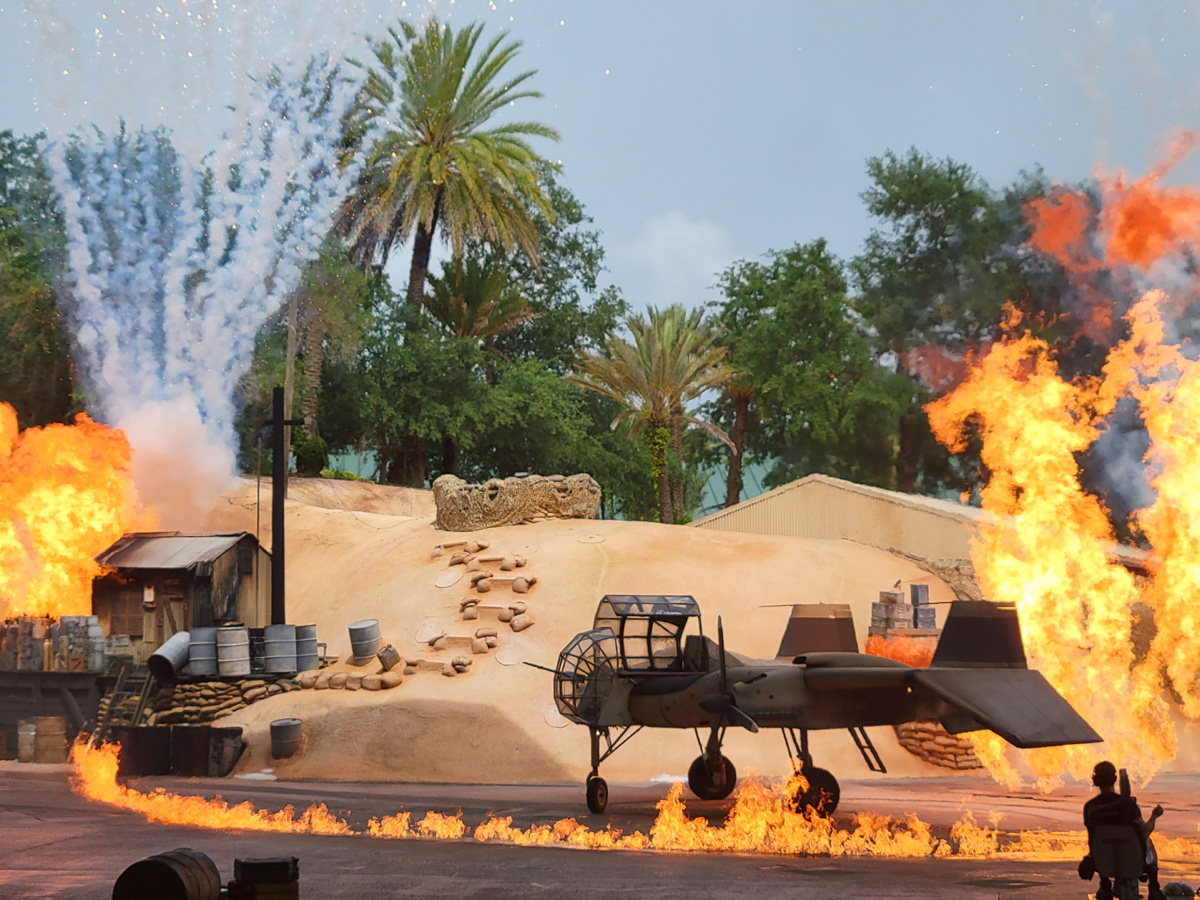 1편이라고 할 수 있는 영화 <레이더스>의 첫장면에 바위가 굴러가는 모습을 실제로 클릭해서 보실 수 있다. 그 후에 영화 속의 각종 스턴트 장면들을 배우들이 조금씩 보여주는데, 하이라이트는 저 벽이 모두 치워지고 나서 사막을 배경으로 펼쳐지는,