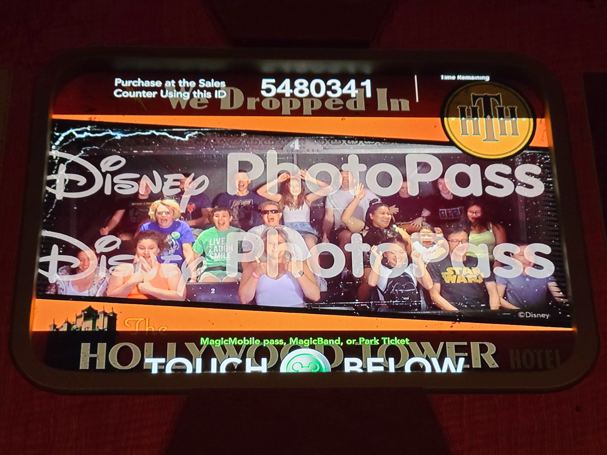 오른쪽 앞줄에 앉은 우리 가족 3명의 모습이 포토패스(PhotoPass) 글자에 가려서 화면에 보인다. 이 아래에 있는 NFC 리더기에 핸드폰이나 매직밴드를 갇다대서, 사진을 바로 다운 받으려면 유료인 포토패스를 앱에서 구입해야 한다.