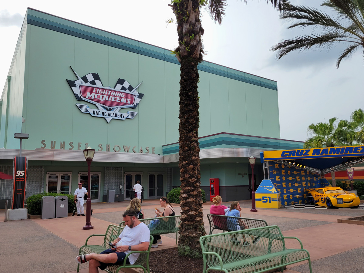 앱으로 확인하니까 타워오브테러는 계속 운행중단이라서 또 옆에 있는 Lightning McQueen's Racing Academy를 구경하기로 했다. 입구 광장에는 <카스>에 등장하는 다른 자동차들만 전시되어 있지만,