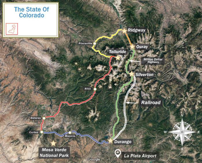 샌후안스카이웨이(San Juan Skyway)는 콜로라도 남서부의 산악지대를 한바퀴 도는 관광도로로, 기아 자동차의 대형 SUV 이름을 따온 마을인 텔루라이드(Telluride)와 '미국의 스위스'라는 별명의 우레이(Ouray), 그리고 거기서 남쪽 실버튼(Silverton)까지 이어지는 '백만불짜리 도로' 밀리언달러하이웨이(Million Dollar Highway) 등으로 유명하다. 또 여기 듀랑고에서 실버튼까지는 미국에서 제일 유명한 관광열차도 매일 운행을 한다.