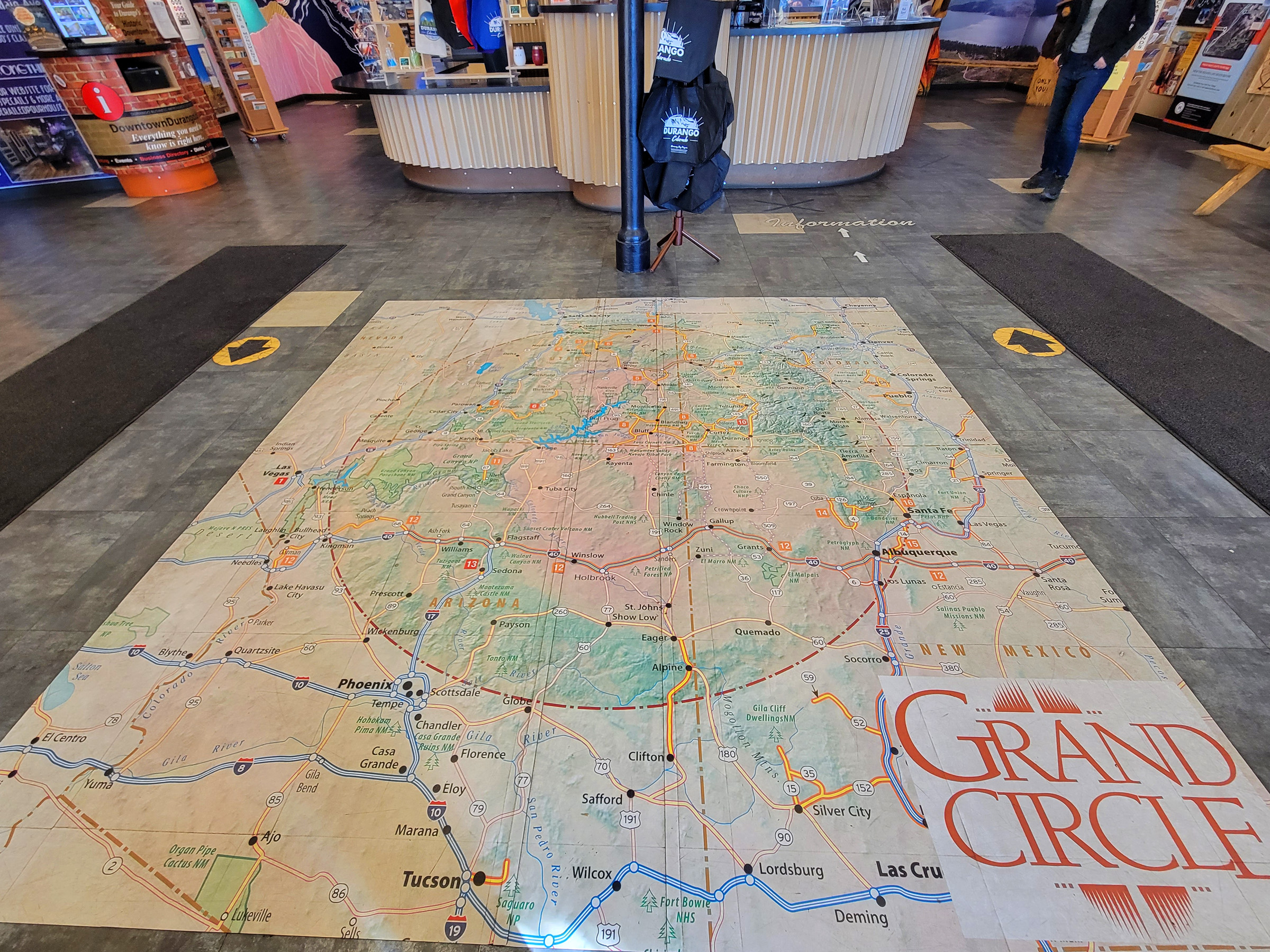 그 중 한 곳의 입구 바닥에 커다랗게 붙어있던 그랜드서클(Grand Circle) 지역을 보여주는 지도이다. 대륙횡단기 전편에서 소개했던 지도보다는 서클의 반지름이 훨씬 더 크고 중심도 남동쪽으로 치우쳐서, 콜로라도 샌후안 국유림(San Juan National Forest)과 뉴멕시코의 산타페(Santa Fe)까지 포함하는 것이 보인다. 사이즈야 어찌 되었건 간에 이제 미서부의 그랜그서클과도 안녕이다~