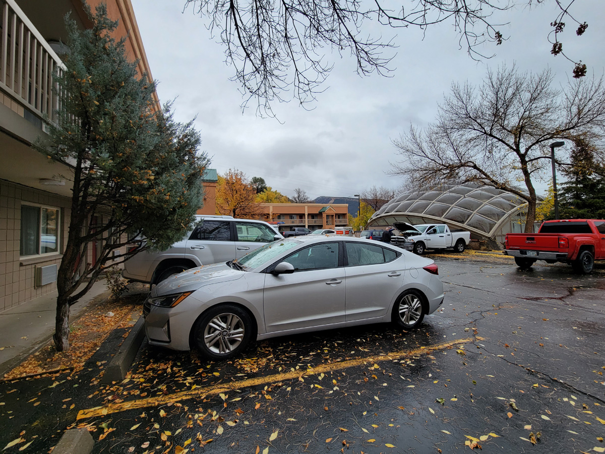 휴식을 위해 2박을 했던 콜로라도 듀랑고(Durango)의 모텔 앞에 세워둔 이삿짐 2호차가 밤새 가을비와 낙엽을 맞았다. "너도 잘 쉬었지? 우리 다시 달려보자꾸나~"