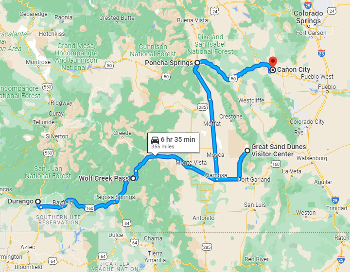대륙횡단 여행기를 쓰면서 그 날의 이동경로를 거의 보여드리지 않았는데, 이 날은 루트가 좀 복잡하기도 해서 기록으로 하나 올려본다. 특히 일부러 표시한 폰차스프링스(Poncha Springs)는 2018년에 블랙캐년(Black Canyon) 국립공원을 구경하고나서 서쪽에서 북쪽으로 지나갔던 곳인데, 이번에는 그 사거리를 남쪽에서 동쪽으로 통과하면서 두 자동차여행의 접점이 만들어진 곳이다. (위 지도에는 Alamosa를 거치는 것으로 되어있지만, 실제로는 거기까지 안 내려가고 그 위의 Mosca를 동서로 지났음)