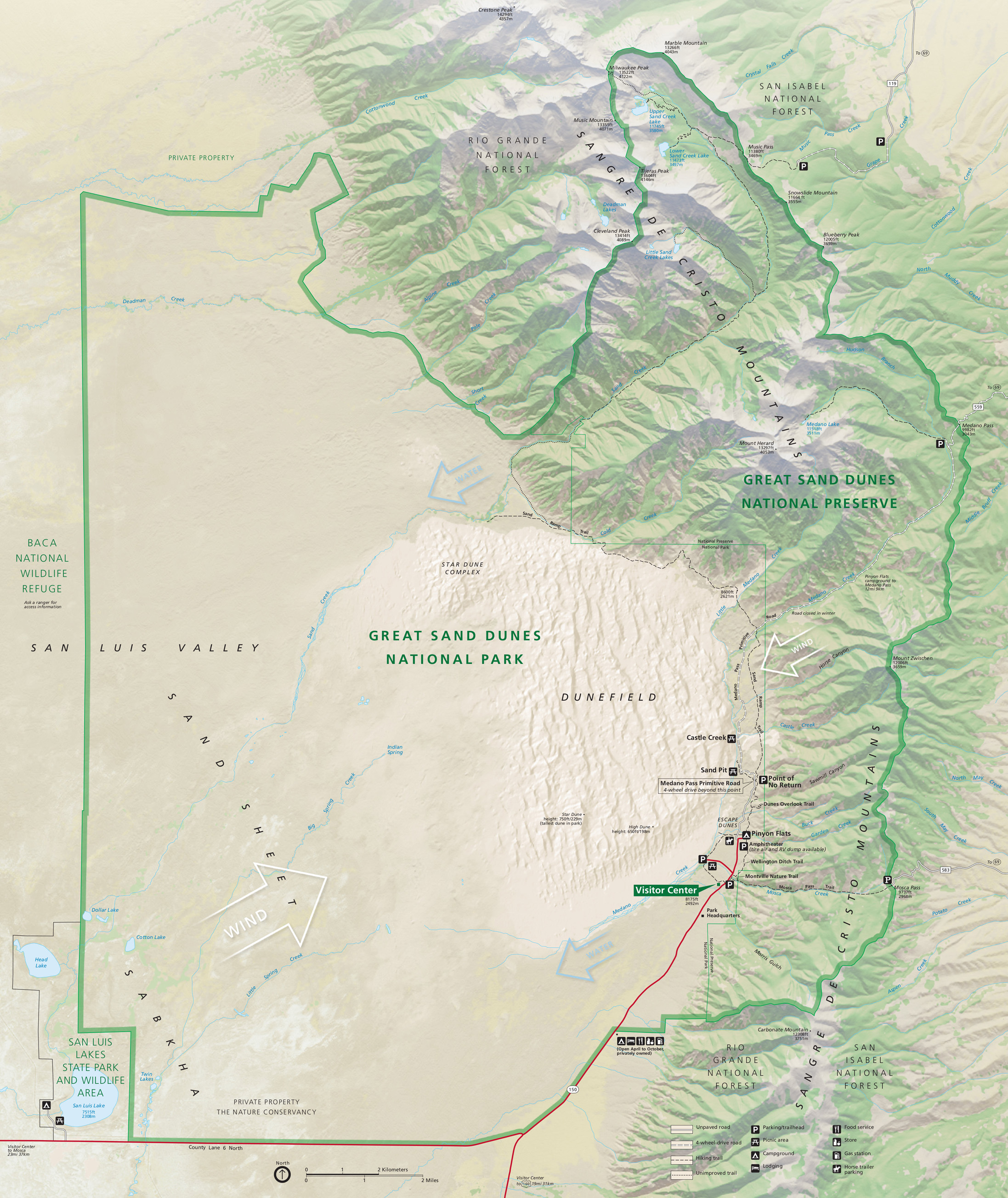 처음 방문한 곳의 여행기니까 잘 보이지 않지만 공원지도도 한 장 올려놓는다. 앞서 사진의 간판에 모두 Great Sand Dunes National Park and Preserve라고 씌여있는데, 중요한 사실은 이 지도에서 가운데 세로방향 녹색의 가는 선을 따라서 국립공원(National Park)과 보호구역(Preserve)이 나누어져 있다는 사실이다. 즉, 별도의 국립공원청 오피셜유닛 두 개가 붙어있는 셈인데, 우리는 모래언덕 부근만 돌아다녔기 때문에, 산맥쪽의 그레이트샌드듄 보호구역은 방문했다고 할 수가 없다.