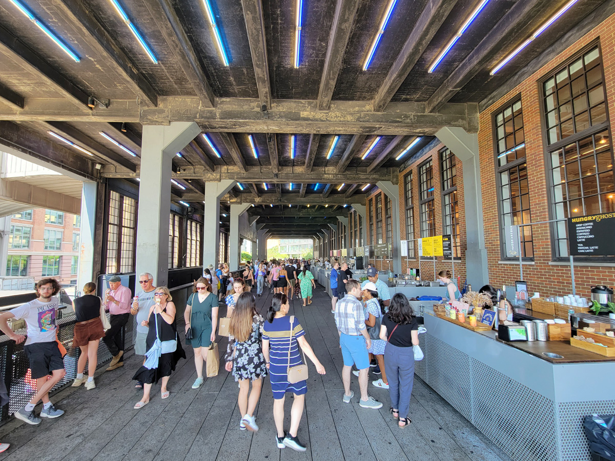 첼시마켓 건물을 통과하는 구간까지 걸어오니 그늘에 많은 가게들이 모여 있었다. 시원한 것을 하나 사서 마시려고 하는데 그늘에는 마땅히 앉을 곳이 없어서 내려가 건물 안에 다시 들어가보기로 했다.