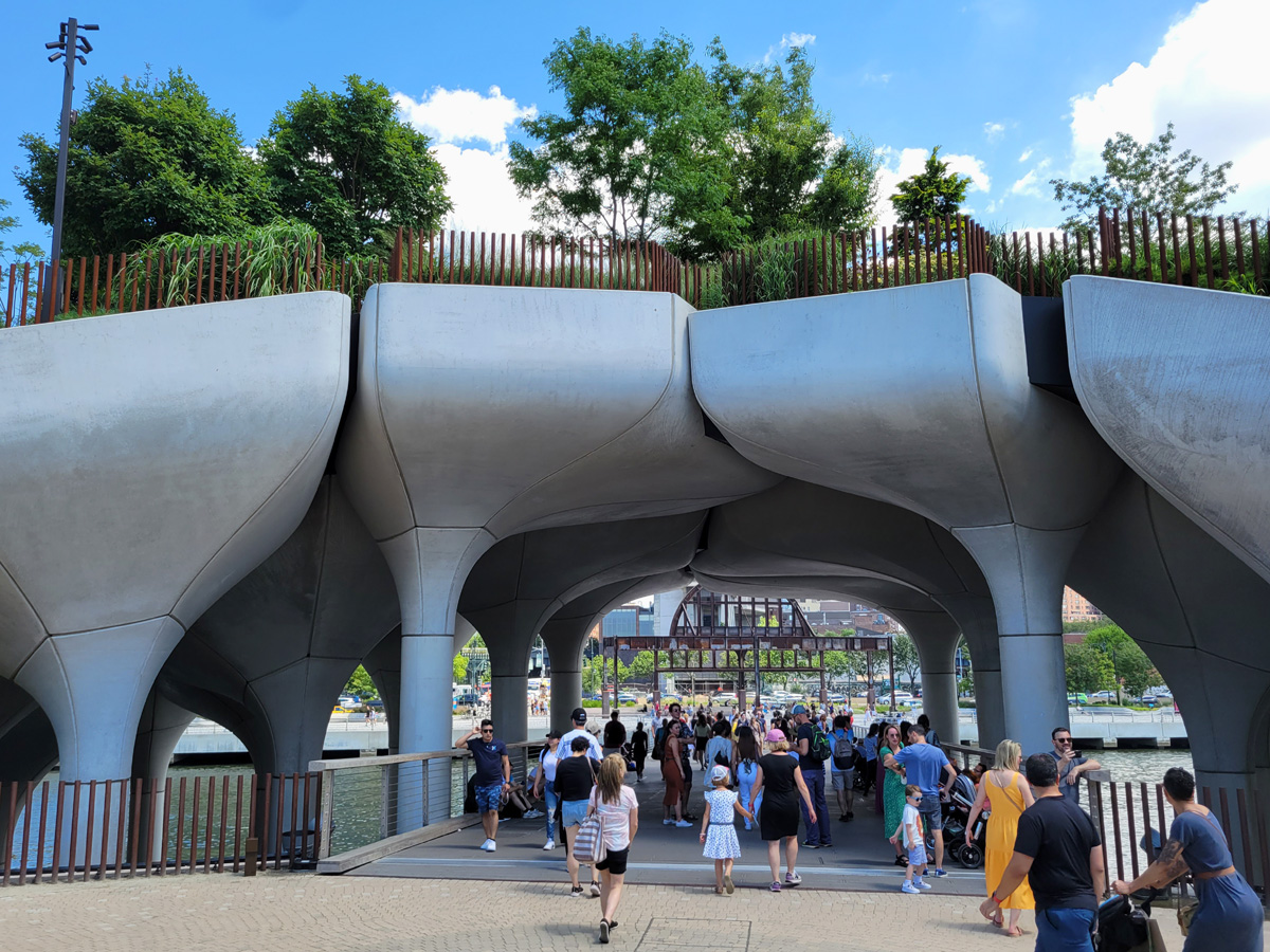 55번 부두가 있던 허드슨 강변에 작년 5월에 문을 연 리틀아일랜드(Little Island)는, 사진과 같이 높이와 모양이 다른 튤립 모양의 콘크리트 기둥 132개를 강바닥에 박아서 만든 인공섬 공원이다. (구글맵으로 위치를 보시려면 클릭) 순전히 저렇게 아랫부분을 멋지게 만든다고 총 공사비가 무려 2억6천만불, 즉 3천억원이나 들었다는데... 리틀아일랜드를 이렇게 비싸게 설계한 사람이 앞서 소개한 토마스 헤더윅이다.