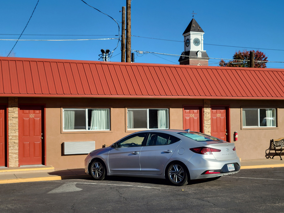2차 대륙횡단의 8일째 아침을 맞았던 콜로라도 캐년시티(Cañon City) 모텔의 우리 방앞에 이삿짐차가 서있는데, 외관은 허름하지만 방도 깨끗하고 포함된 아침식사도 괜찮았던 기억이다. 체크아웃을 하고는 강가의 이 마을을 떠나서, 어제 오후에 내려왔던 언덕을 다시 서쪽으로 50번 국도를 따라 거슬러 한 참을 올라가서 절벽에 걸린 그 다리를 찾아갔다.