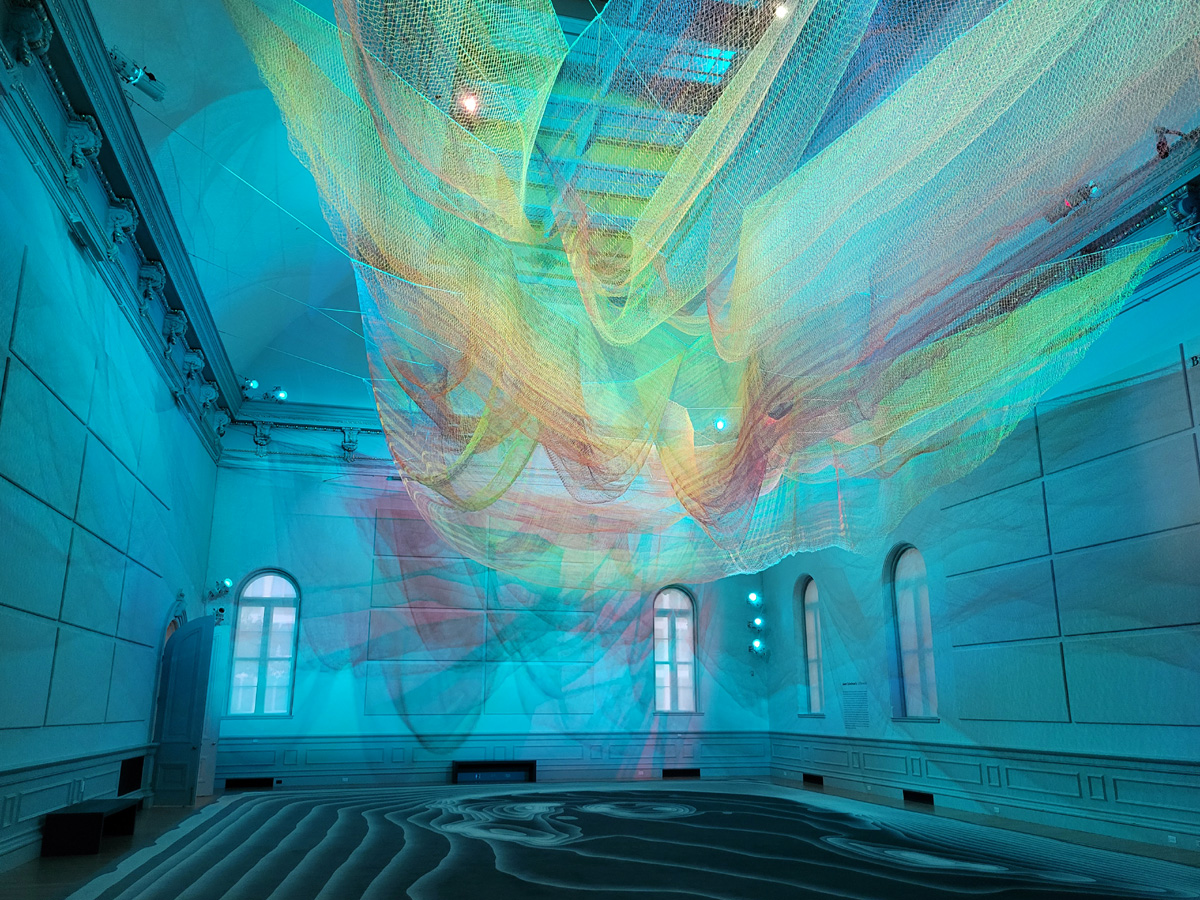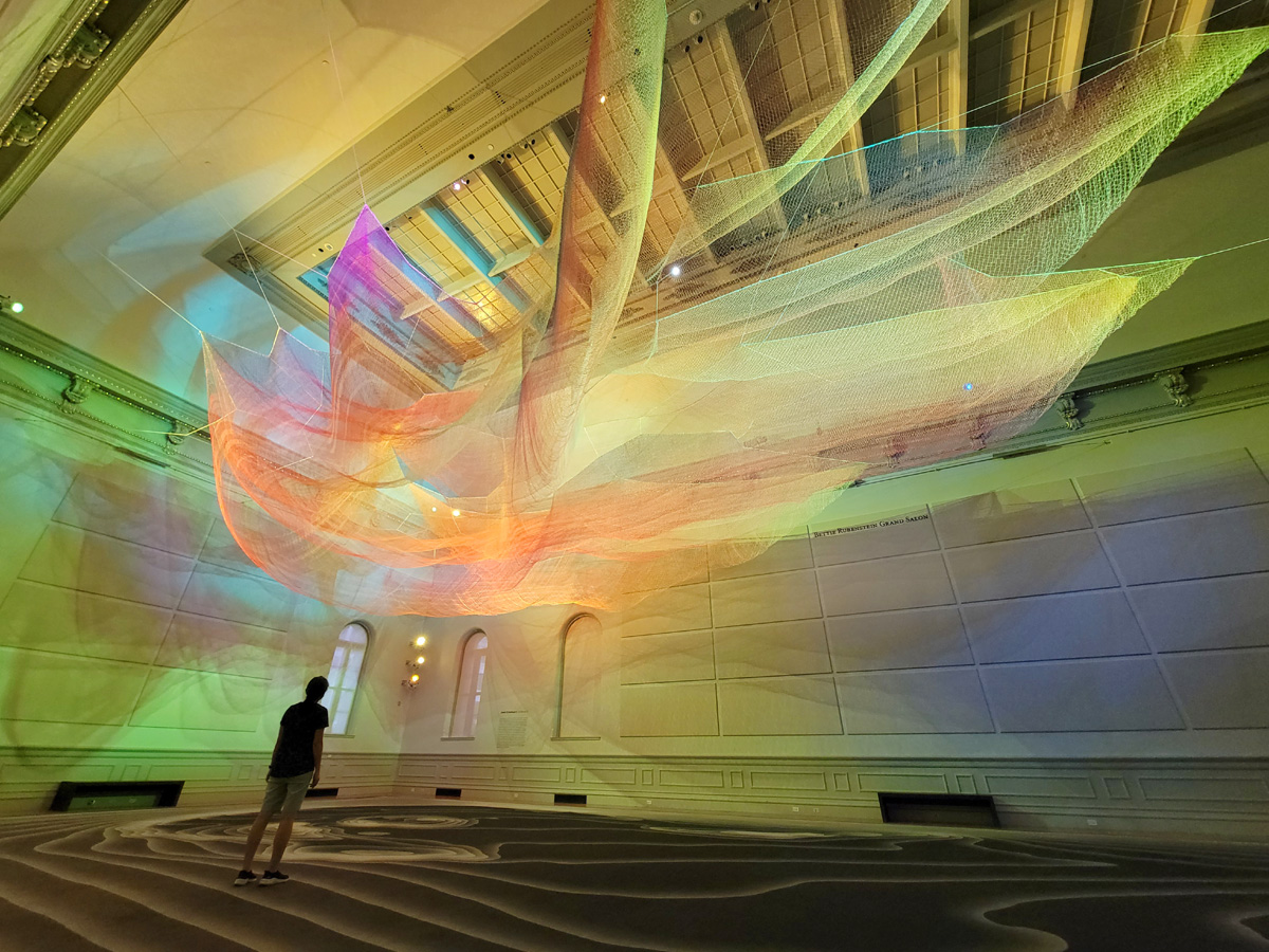 넓은 공간에는 색색의 조명을 받는 커다란 그물(?)이 사방으로 매달려서 미세하게 흔들리고 있고, 바닥에는 등고선처럼 보이는 그림이 그려져 있었다. 멀리 벽에 붙은 설명에 따르면 작품명 <1.8 Renwick>은 2011년 일본 토호쿠 대지진으로 지구의 자전주기가 백만분의 1.8초 짧아진 것을 의미하는 것으로 인간과 물리적 세계의 상호작용을 나타내고 있단다. "현대미술에 대한 설명은 더 이상 쓰지 않기로 다짐했었는데..."