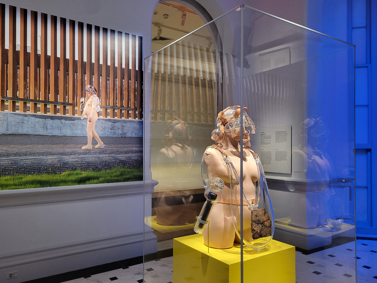 또 행위예술(?) 작품도 있었는데, 전시된 유리로 만든 고글과 헬멧 및 물주머니에 슬리퍼까지 유리로 만들어서 신고는 뒤쪽 사진과 같이 멕시코 국경장벽 앞을 걸었단다. 하지만 유리 슬리퍼가 깨지는 바람에 얼마 못가서 포기했다고... '국경의 신데렐라'인가?