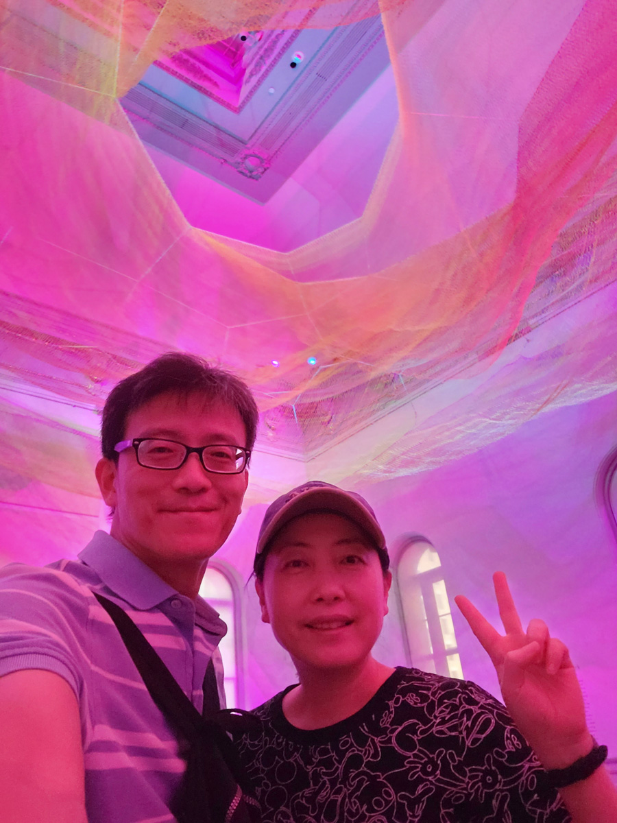 아래에서 올려다 보니 구멍이 뚫린 그물을 배경으로 커플셀카를 찍을 때는 조명이 보라색 계열로 천천히 바뀌었다~