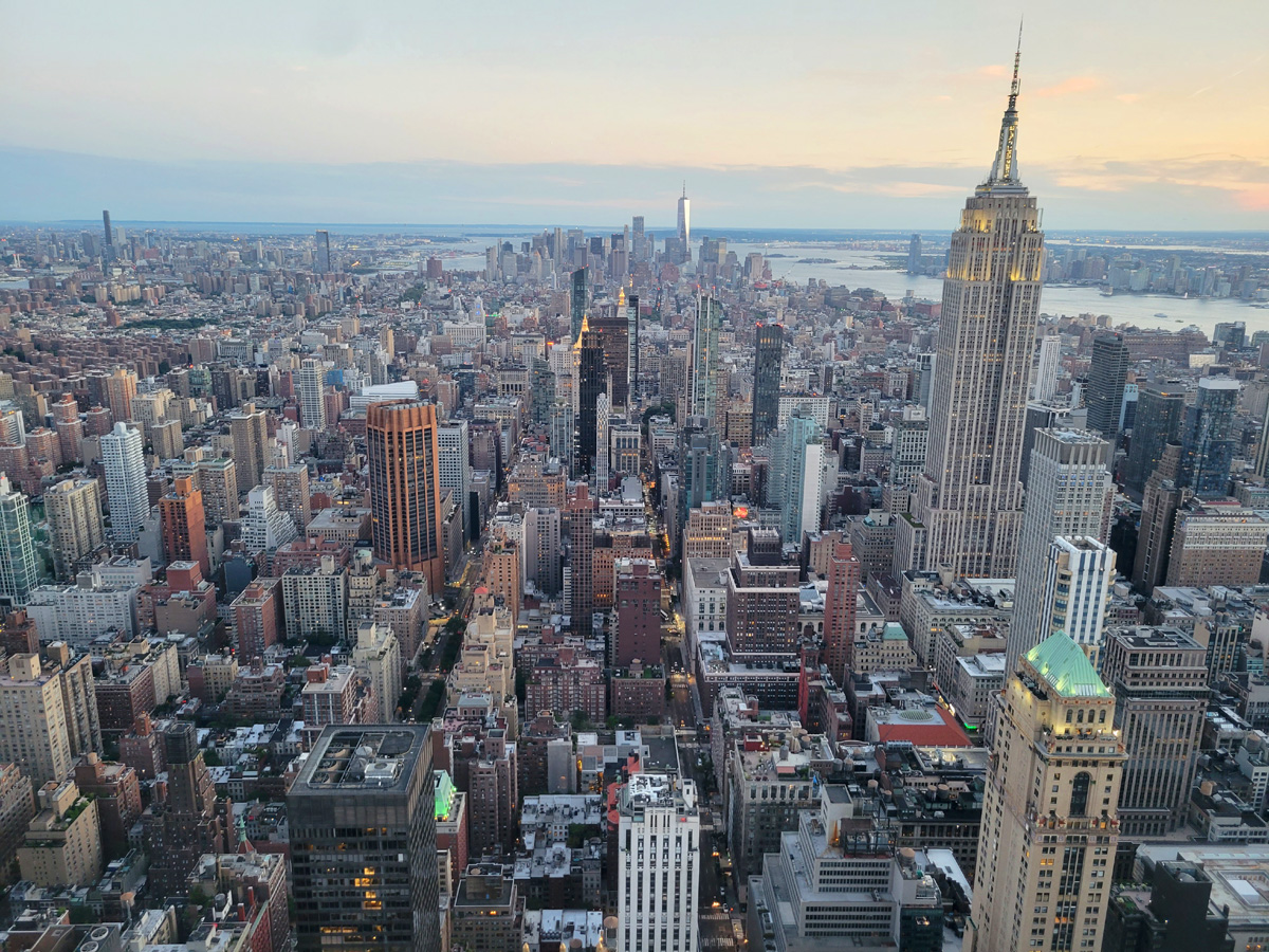 아내와 딸이 왼쪽 통유리 창가에 서서 엠파이어스테이트 빌딩을 바라보고 있다. 이 날의 선셋타임이 7시55분이었는데 우리는 저녁 8시로 예약을 해서 올라왔으니까 일몰시간에 딱 맞춰서 방문을 했던 것이다.