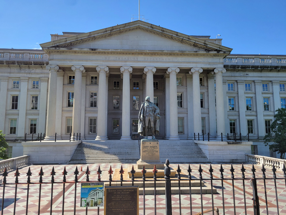 백악관 동쪽에는 1869년에 현재의 모습으로 완공된 미국 재무부(Department of the Treasury) 건물이 우뚝 서있다. 사진의 동상은 제퍼슨의 지명으로 13년 가까이 재무장관을 지냈던 앨버트 갤러틴(Albert Gallatin)으로 지금 뉴욕대학교(New York University, NYU)의 설립자이기도 하단다.