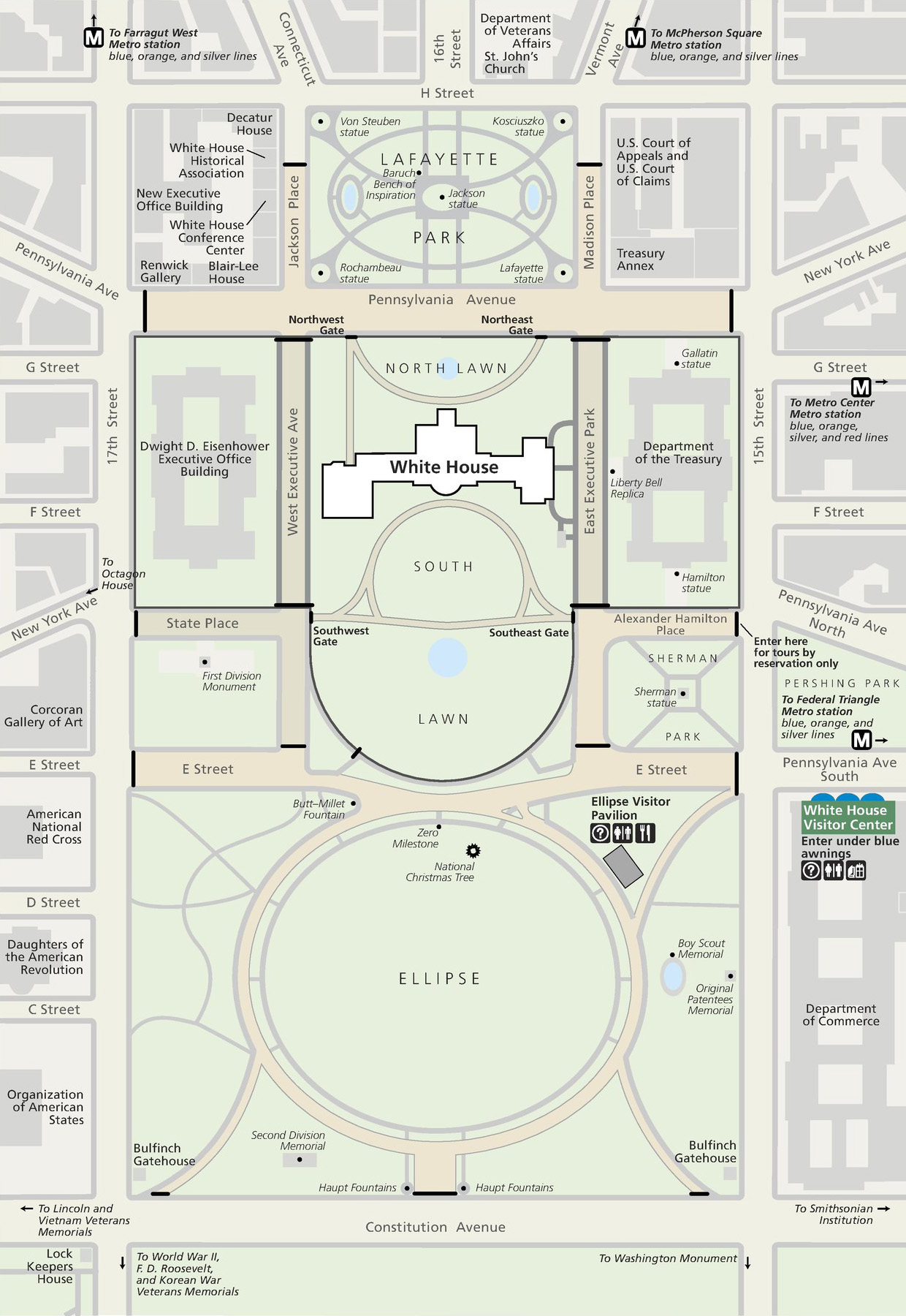 '대통령의 공원' 영역을 보여주는 지도로, 우리는 2011년 봄방학 동부여행 때부터 남쪽 타원형의 넓은 잔디밭인 Ellipse에서 백악관의 남쪽 모습은 여러 번 봤지만, 더 가까이 보이는 북쪽 정문의 모습은 한 번도 직접 본 적이 없었다. 그래서 이번에 지하철을 타고 Farragut West 역에서 내린 후에, 먼저 지도 좌측상단에 작게 표시된 렌윅갤러리(Renwick Gallery)를 구경했고, 이제 백악관이 주소를 둔 펜실베니아 애비뉴(Pennsylvania Avenue)를 따라 걸으며 구경을 하는 것이다.