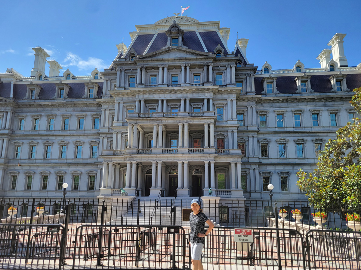 백악관 서쪽에 있는 아이젠하워 행정동(Eisenhower Executive Office Building)은 1888년에 완공되어서, 1943년에 펜타곤이 만들어지기 전까지는 세계에서 가장 큰 사무실 건물이었단다. 처음에는 국무부/전쟁부/해군이 사용했지만 지금은 대통령실 부서들과 부통령 집무실이 입주해 있다. 여기를 거쳐간 많은 부통령과 대통령들을 다 제치고 아이젠하워의 이름을 붙인 이유는, 그가 육군에 복무하며 1927년부터 1935년까지 가장 오랫동안 이 건물에서 일을 했기 때문이라고 안내판의 씌여있었다.