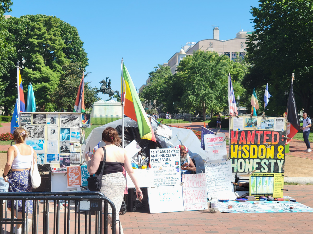 이렇게 백악관 정면을 바로 마주보고 있는데, 노란 도화지에는 "정전협정을 평화협정으로!"라는 한글 구호도 씌여있었다. 조사를 해보니까 White House Peace Vigil은 1981년에 William Thomas가 시작했는데, 그가 2009년에 사망한 후에는 Concepción Picciotto라는 여성이 2016년에 죽을 때까지 이어갔단다. 그 후로는 여러 참가자들이 24시간 돌아가면서 계속 자리를 지키고 있는데, 사람이 없으면 당국에서 시설을 철거해왔기 때문이라고 한다.