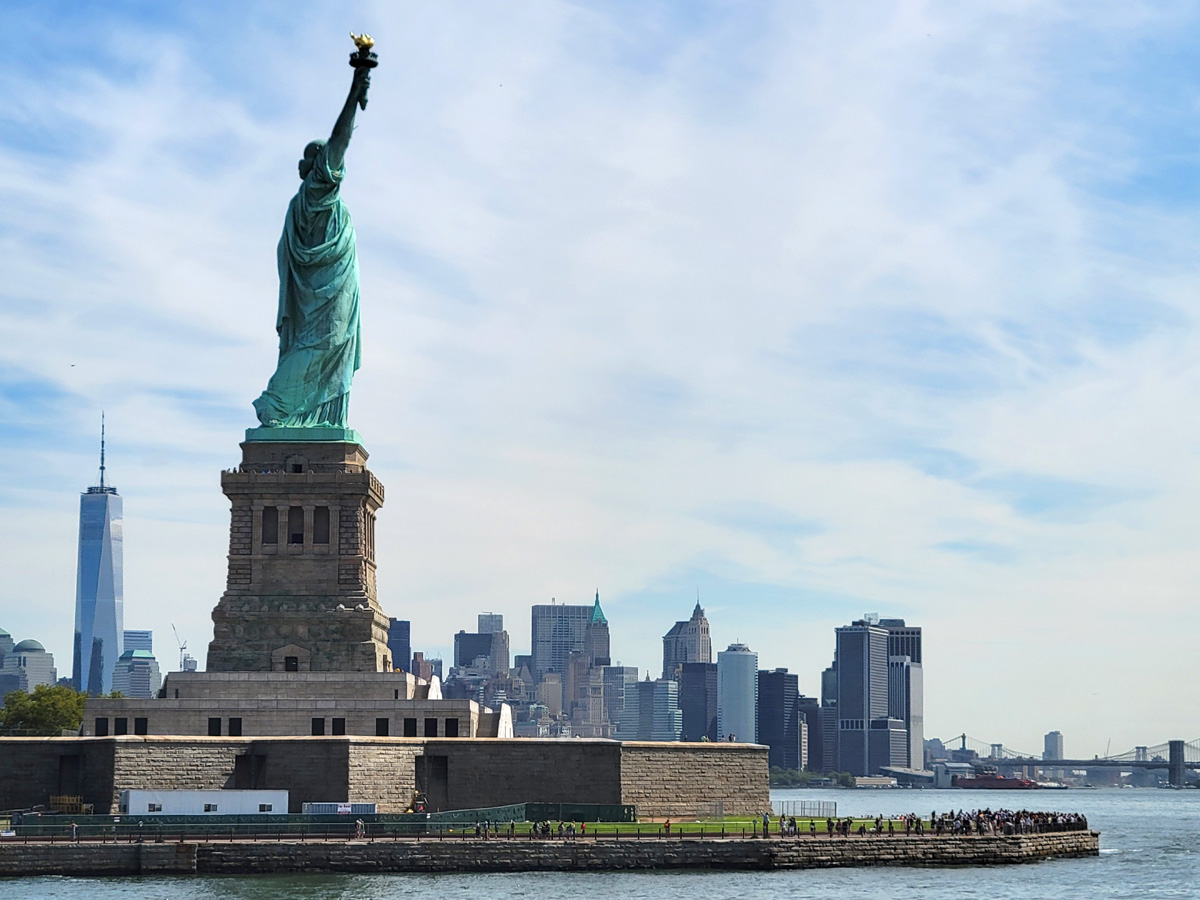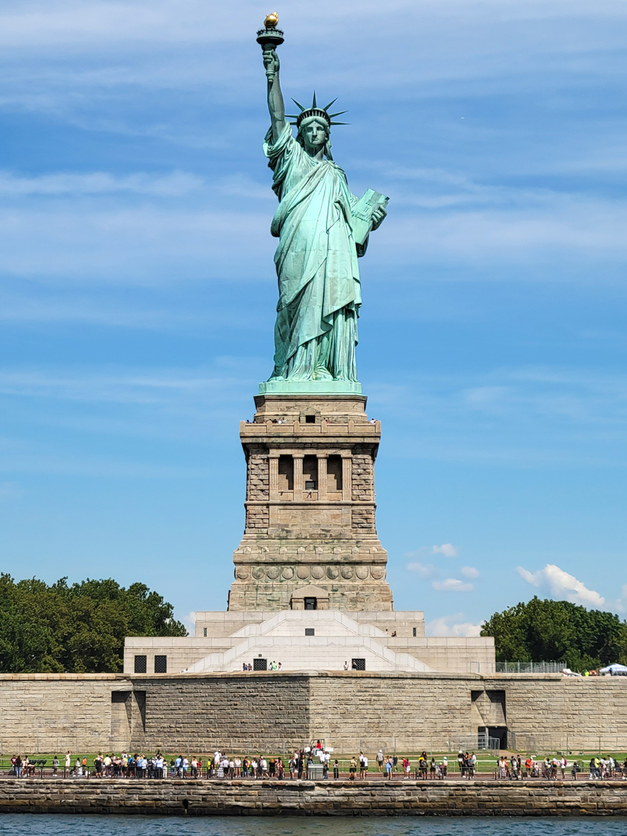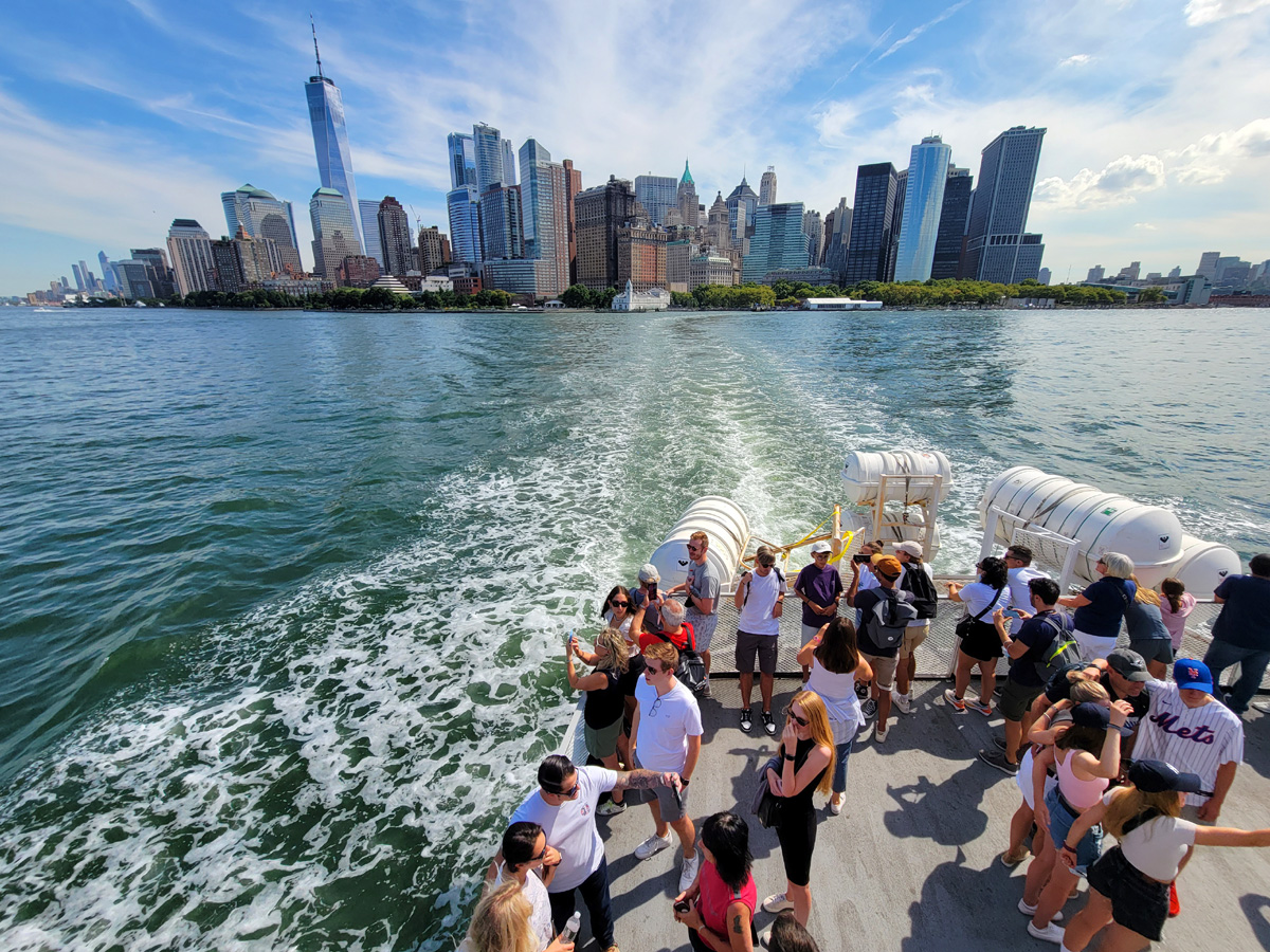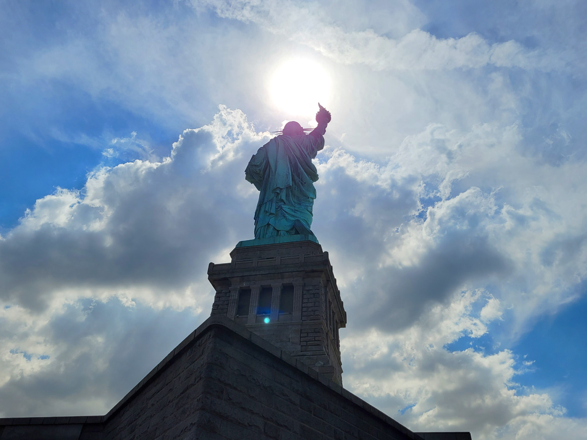 선착장이 섬의 뒤쪽에 있기 때문에, 배가 이렇게 뒤로 돌아가면 맨하탄을 배경으로 자유의 여신상 뒷모습을 조망할 수도 있다. 한 쪽 발의 뒷꿈치가 들려있는 이유는 횃불을 들고 앞으로 전진하는 모습을 형상화했기 때문이다.
