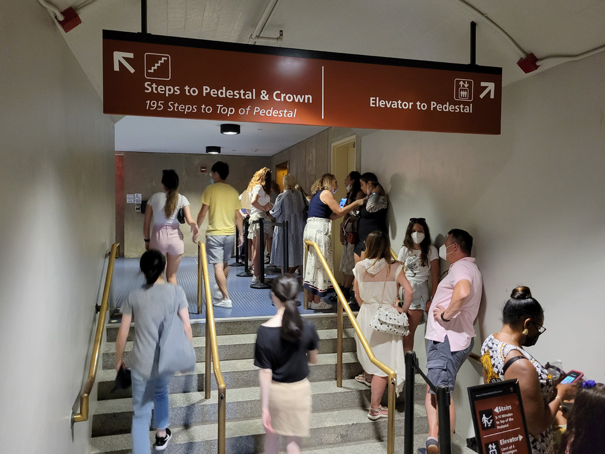 발판(Pedestal)까지 195개의 계단을 걸어서 올라갈 것이냐? 아니면, 한 번에 4명만 타는 엘리베이터를 기다릴 것이냐? 참고로 현재는 동상의 몸속을 지나서 왕관(Crown)까지 올라가는 것은 중단된 상태이다.
