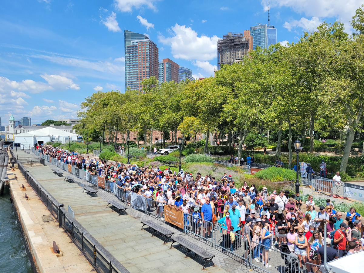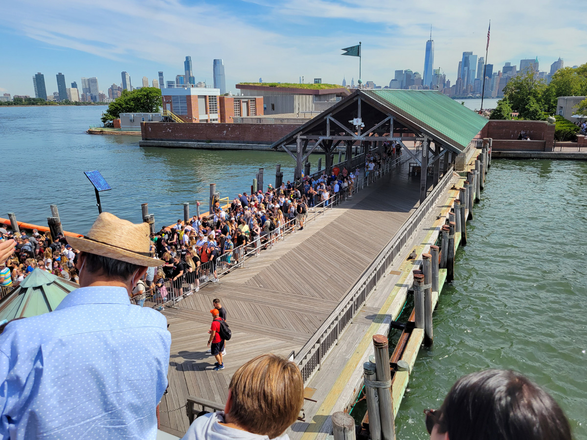 정오의 땡볕 아래에서 우리가 타고 온 배를 기다리고 있는 사람들이 보안검색장까지 부두에 가득 차 있었다. 오후로 갈 수록 기다리는 시간이 점점 길어져서 한 시간 이상을 기다리는 경우도 있다고 하므로, 뉴욕 맨하탄쪽에서 리버티 섬으로 향하는 배를 타실 계획인 분들은 가능한 아침 일찍 출발하는 표를 사전에 예매하시는 것을 꼭 권해드린다.