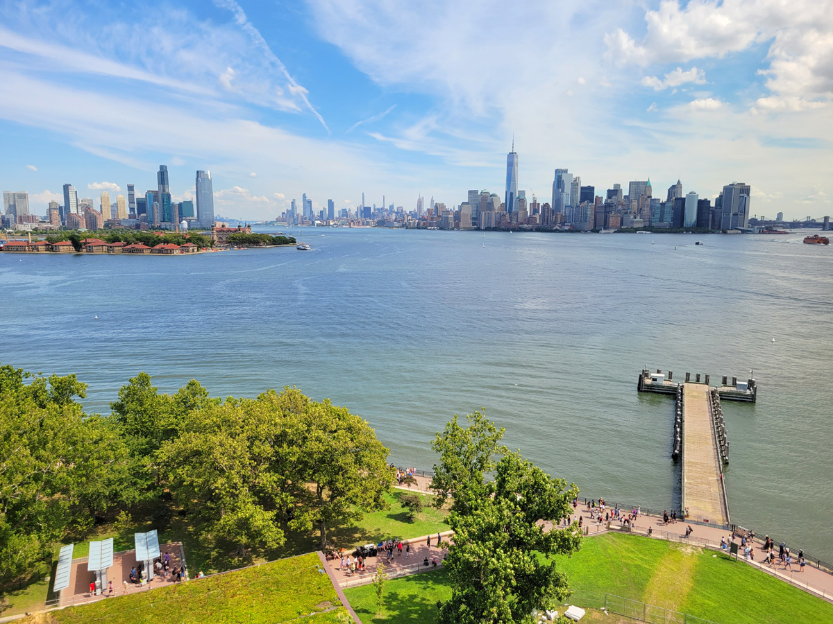 수면 위로 27미터 높이의 발판 전망대에서 바라본 뉴욕 맨하탄(Manhattan)과 뉴저지 저지시티(Jersey City)의 고층건물 풍경이다. 왼쪽에 빨간 지붕의 낮은 건물들이 모여있는 곳이 1892-1954년 동안에 배를 타고 온 이민자들의 입국심사와 수용시설이 있었던 엘리스 섬으로 1천2백만명 이상이 저기를 통해 미국에 들어왔단다.
