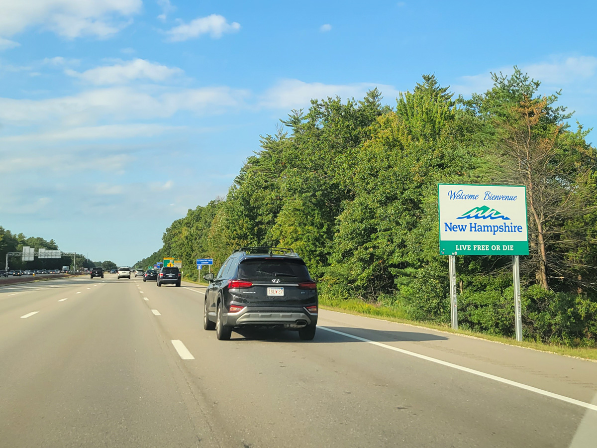 프랑스어를 쓰는 캐나다 퀘벡과 접해 있어서, 환영 단어가 불어로도 씌여있는 뉴햄프셔(New Hampshire)인데, 제일 아래에 적혀있는 "LIVE FREE OR DIE"라는 주의 모토(motto)가 무시무시하다... 유명한 "자유가 아니면 죽음을!" 구호는 프랑스 혁명부터 등장했지만, 뉴햄프셔 출신의 미국 독립전쟁 영웅인 John Stark 장군이 전승기념식에 보낸 편지의 말미에 이 문구를 쓴 것을 기념해 1945년에 공식적으로 주표어로 채택되어서, 뉴햄프셔 주 자동차 번호판에도 모두 들어가 있다.