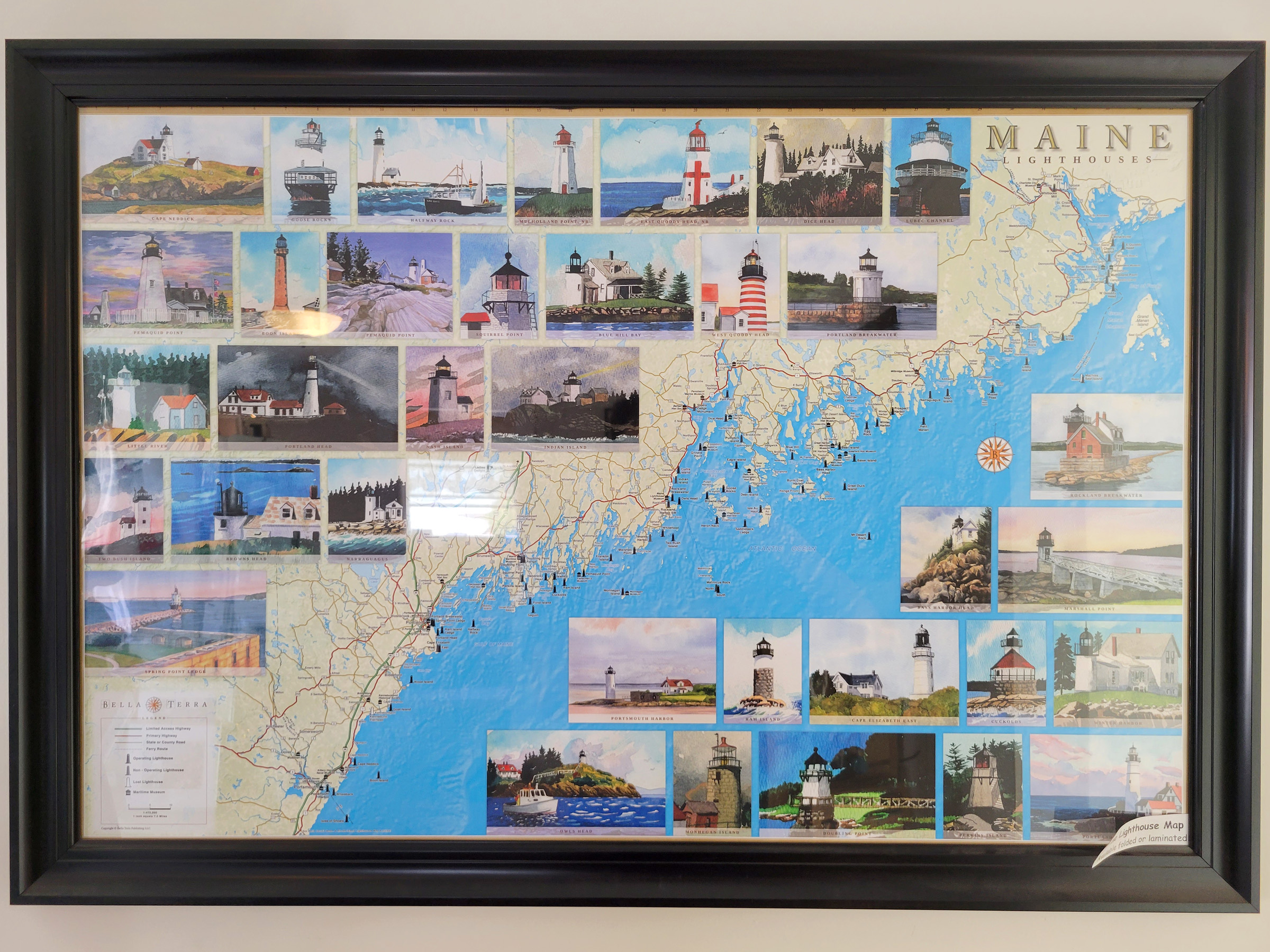 메인(Maine) 여행기를 미시간 지도로 시작한 것이 마음에 걸려서, 가게에 걸려있던 메인 주의 등대들을 표시한 지도의 사진을 마지막으로 보여드리기로 했다.^^ 대서양에 접한 가장 북쪽의 미국땅인 메인 주의 바닷가는 옛날 빙하의 침식작용으로 피요르드처럼 좁게 내륙 깊숙히 들어온 바다 때문에 해안선이 울퉁불퉁하고 섬들도 많아서, 해안선 길이에 비해 많은 등대가 건설되었단다. 대표적인 등대 사진들 오른편 두번째 줄에 '포레스트 검프 등대'가 보이고, 이제 우리 부부는 계속해서 1번국도를 또 2시간 더 달려서, 그 바로 옆에있는 사진의 등대로 유명한 국립공원을 찾아간다.